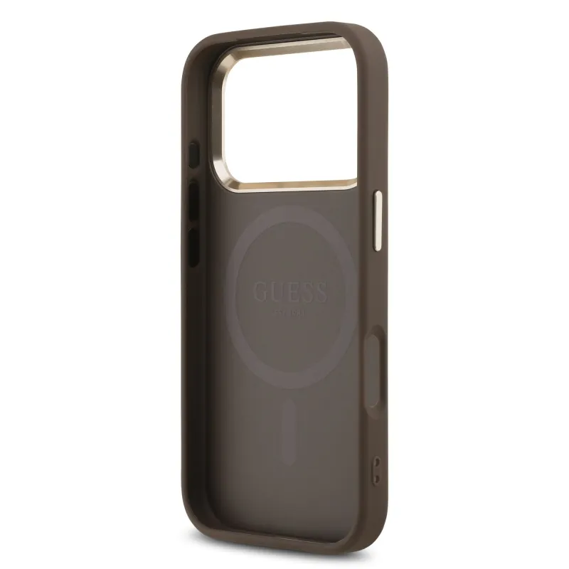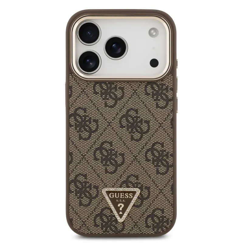Guess PU bőr 4G Strass háromszög logó arany keret MagSafe hátlap iPhone 17 Pro barna 17 Pro barna