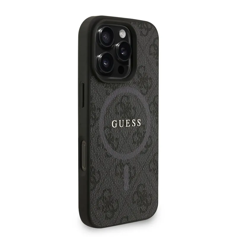 Guess PU bőr 4G színes gyűrűs pánt MagSafe hátlap iPhone 16 Pro Max-hoz fekete