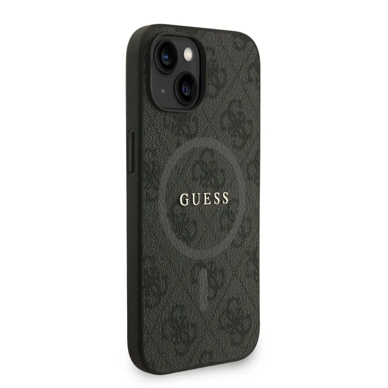 Guess PU bőr 4G színes gyűrűs pánt MagSafe hátsó borító iPhone 14-hez Fekete