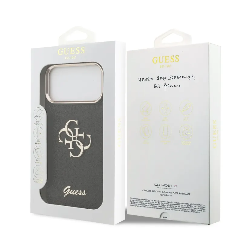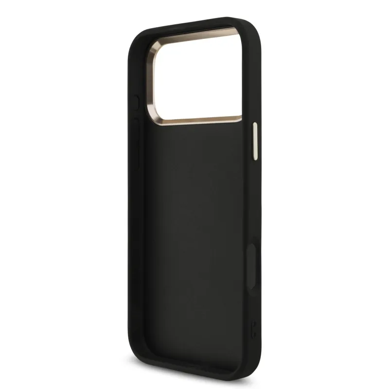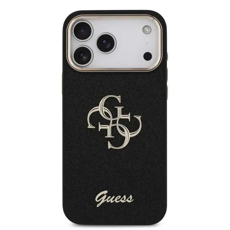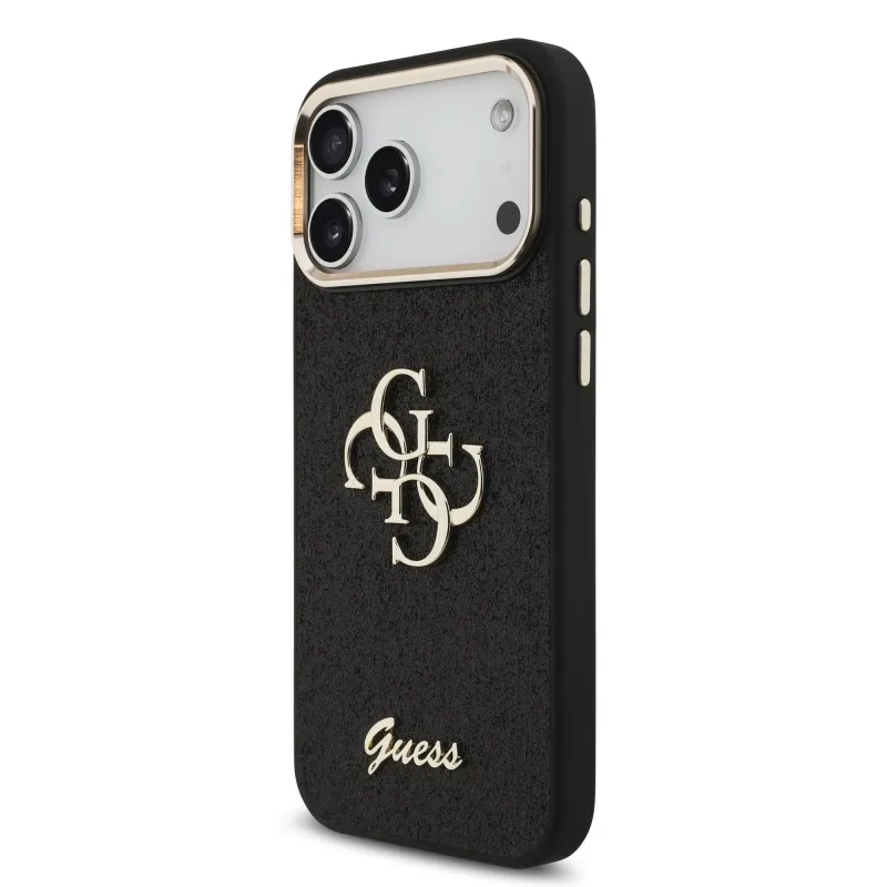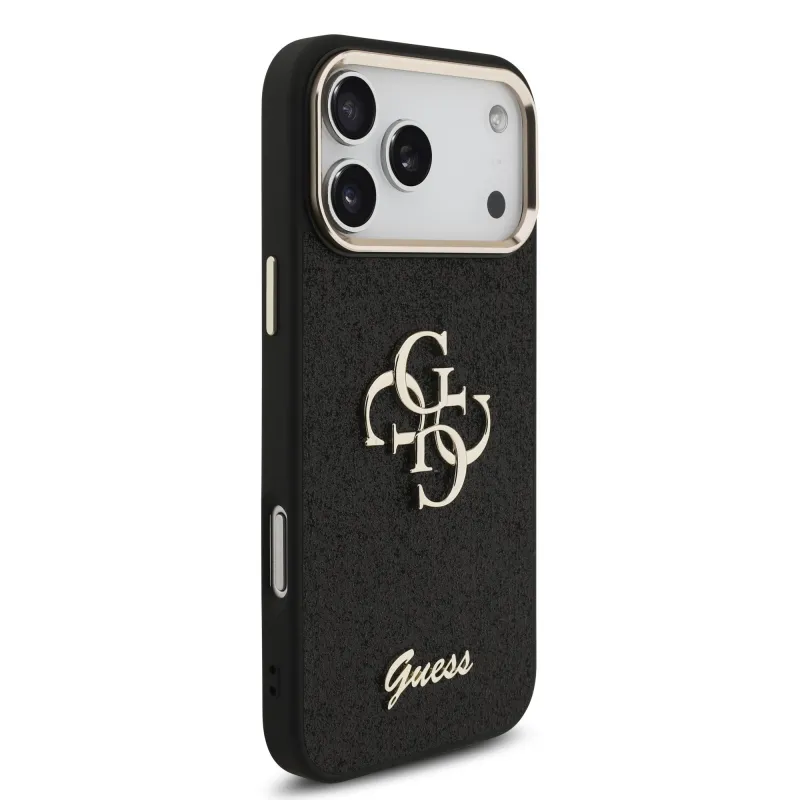 Guess PU Fixed Glitter 4G fémkeret hátsó borító iPhone 17 Pro Max-hoz fekete