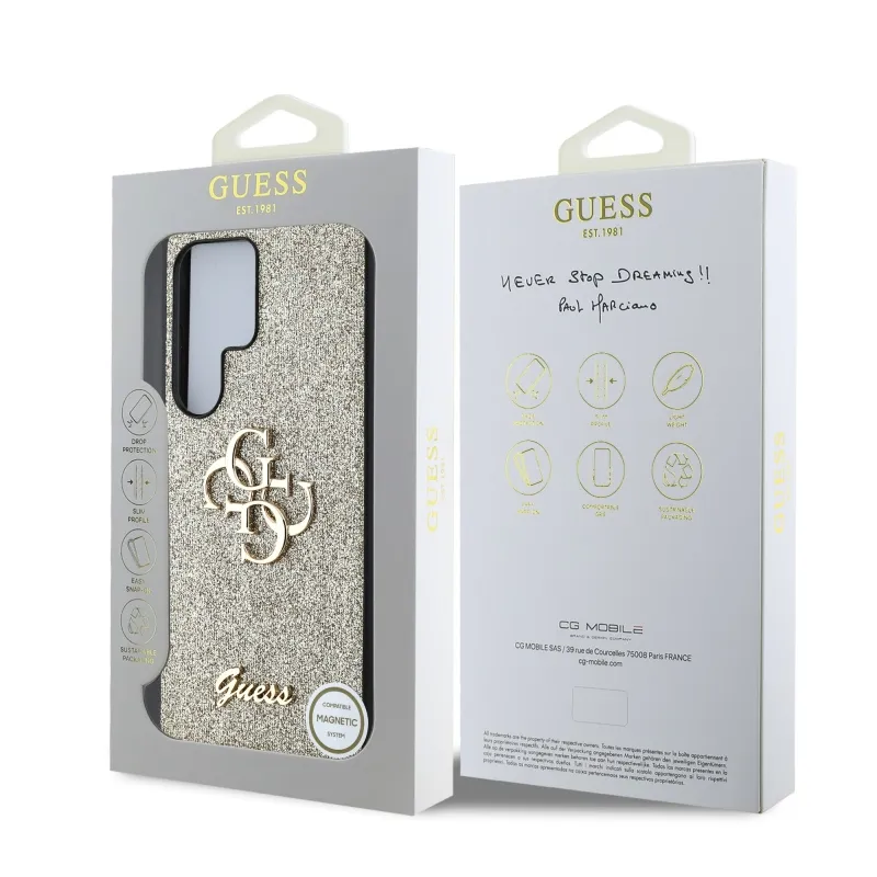 Guess PU Fixed Glitter 4G Metal Logo hátlap Samsung Galaxy S25 Ultra Gold számára
