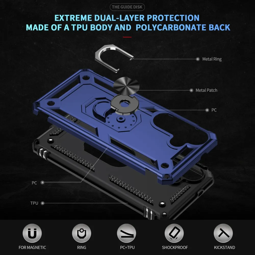 A Ring tartós hibrid tok biztonságot nyújt a telefonodnak minden oldalról és hátulról is, a mozgatható lencsevédő és az enyhén megemelt szélek pedig tökéletes védelmet nyújtanak az érzékeny részeknek. A fém rész lehetővé teszi a mágneses autós tartók használatát.