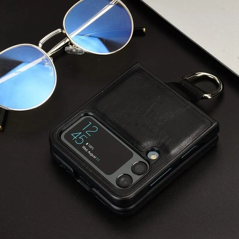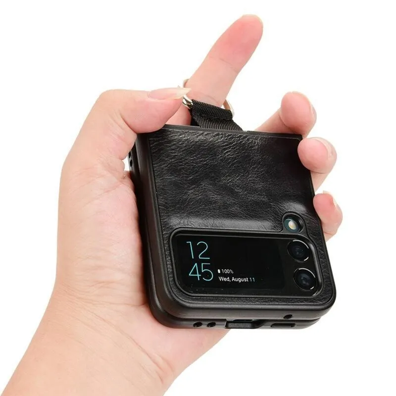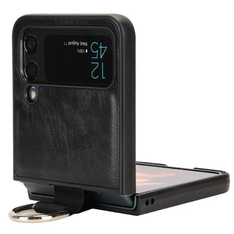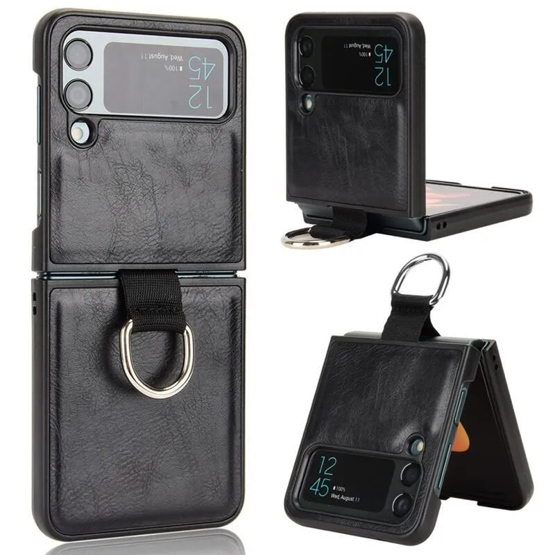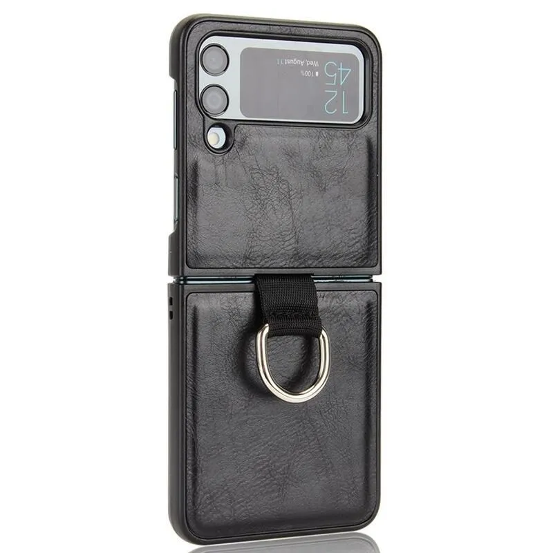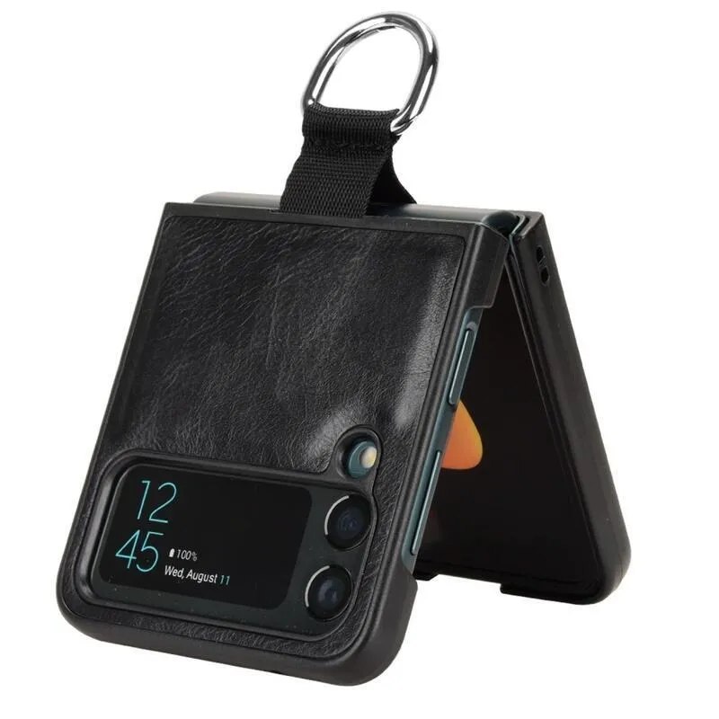 Gyűrűs műanyag borítás PU bőrrel bevont hurokkal a mobiltelefonra Samsung Galaxy Z Flip4 5G - fekete