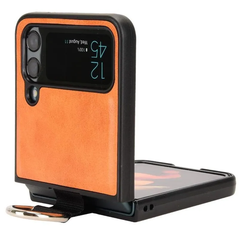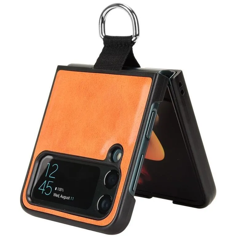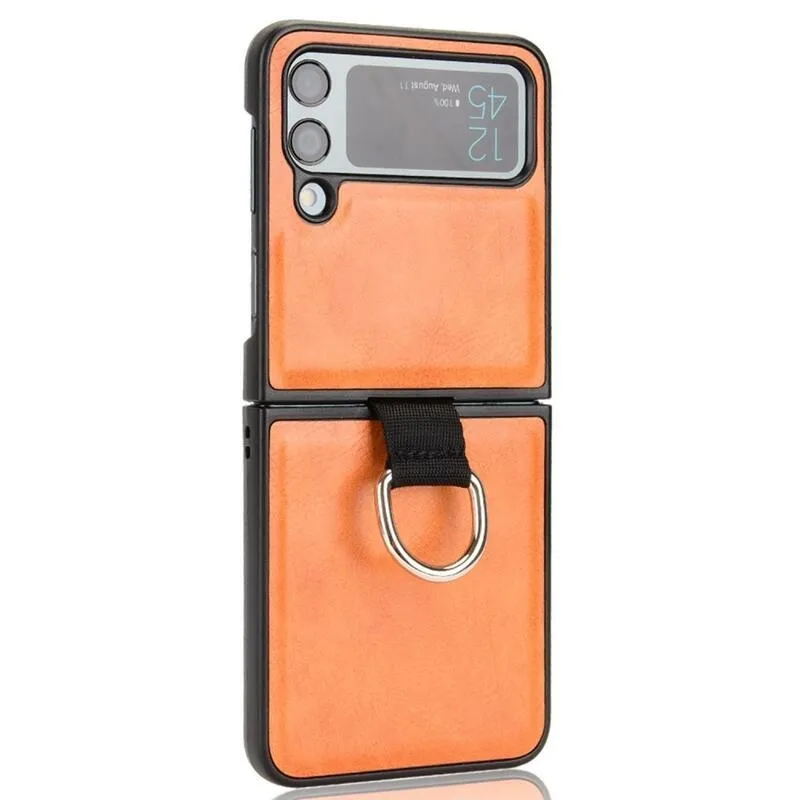 Gyűrűs műanyag borítás PU bőrrel bevont hurokkal a mobiltelefonra Samsung Galaxy Z Flip4 5G - narancssárga