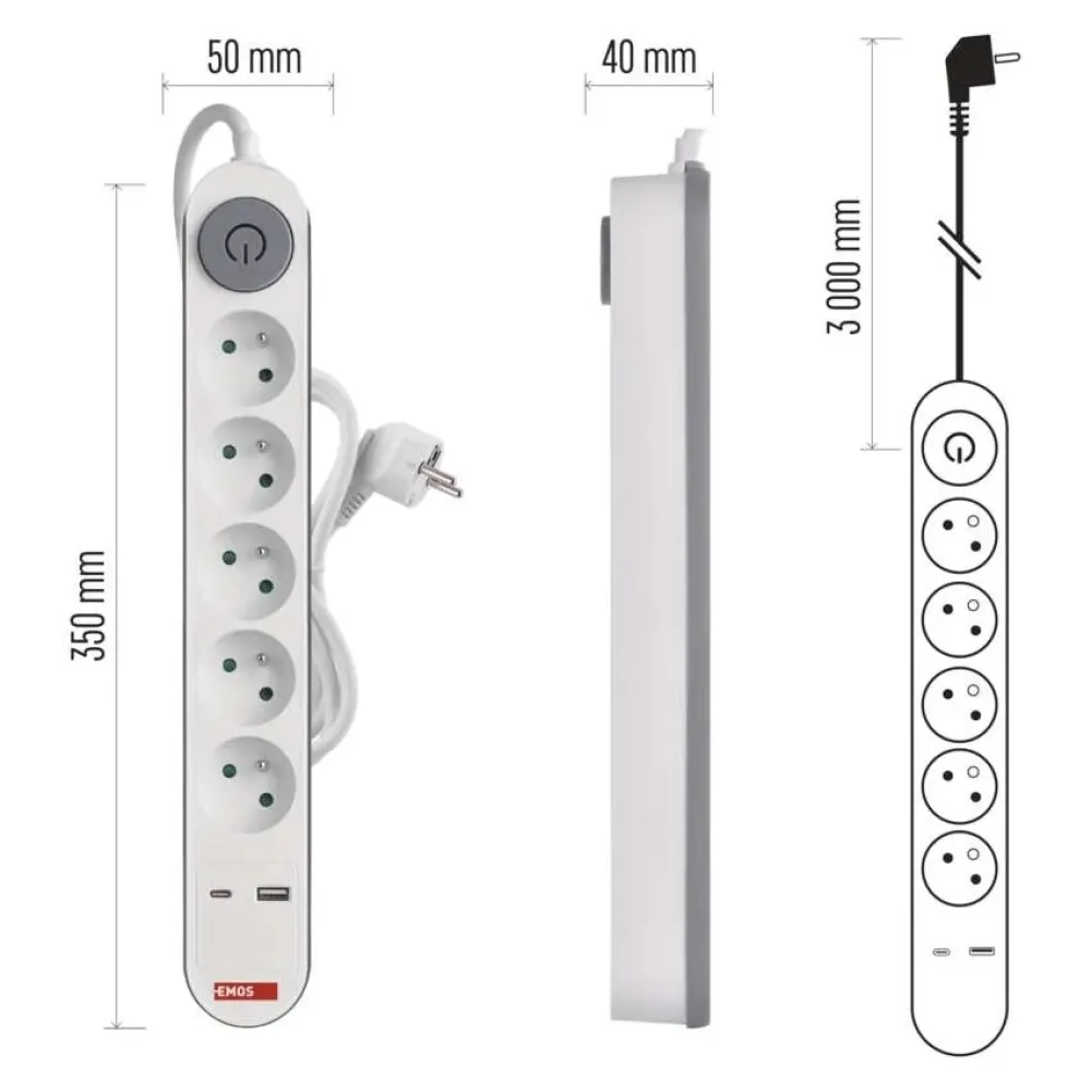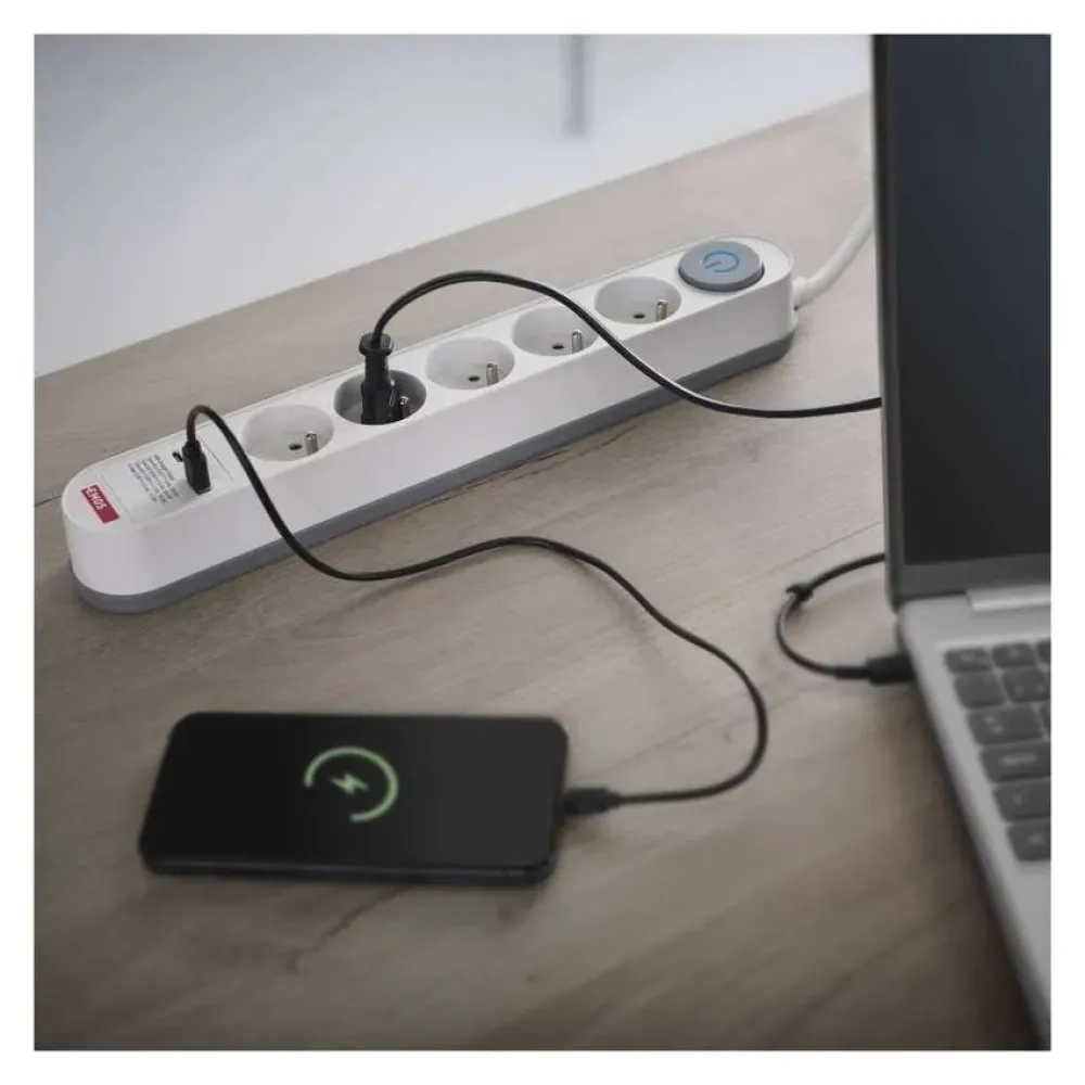 Hosszabbító kábel 3 m / 5 aljzat / kapcsolóval / fehér / 1×USB-A + 1×USB-C / 1,5 mm2