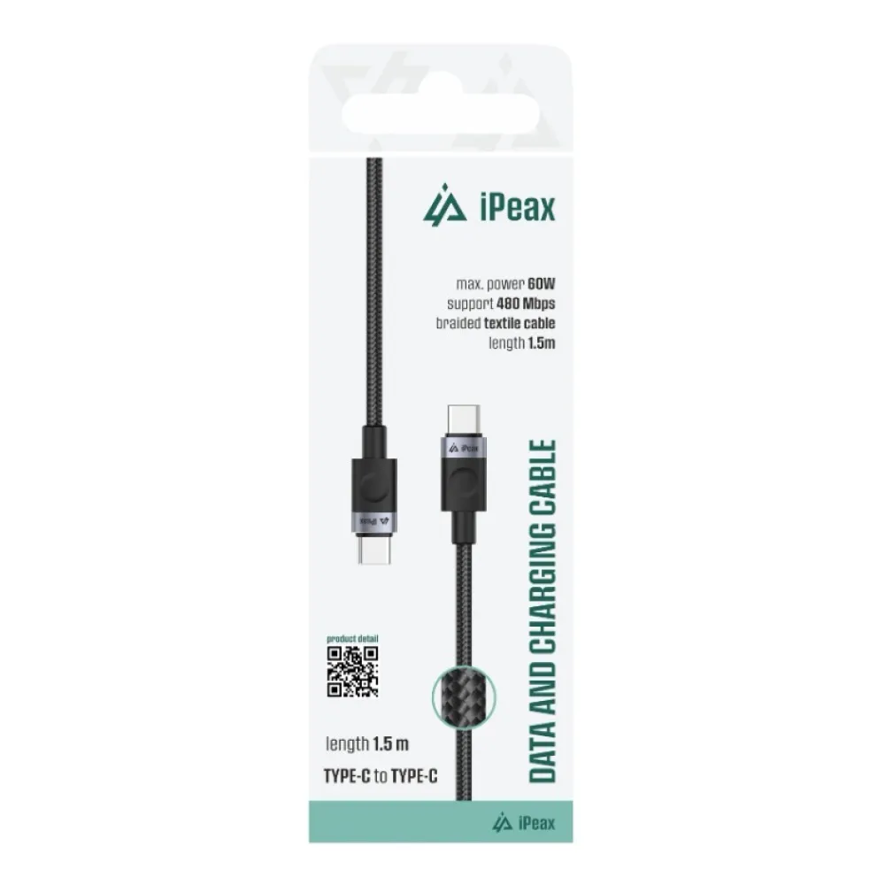 iPEAX textil kábel USB-C / USB-C 1,5 m, USB 2.0 - fekete