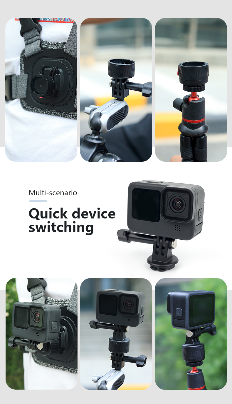 A tartó strapabíró ABS műanyagból és fém elemekből készült, amelyek stabil és biztos rögzítést nyújtanak. Az erős mágnes és a mechanikus rögzítés együttese segít a kamerát biztonságosan a helyén tartani mozgás közben is. A precíz kialakítás csökkenti a nem kívánt mozgást és hozzájárul a stabil képminőséghez.