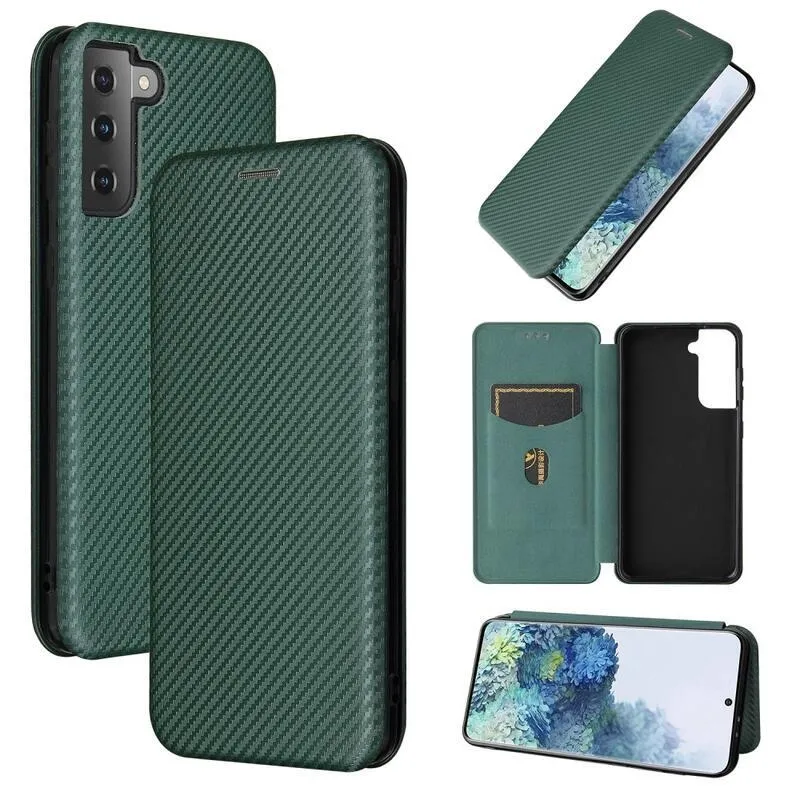 Karbon PU bőr pénztárca tok Samsung Galaxy S21 Plus-hoz - zöld