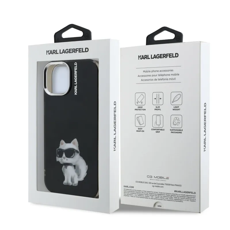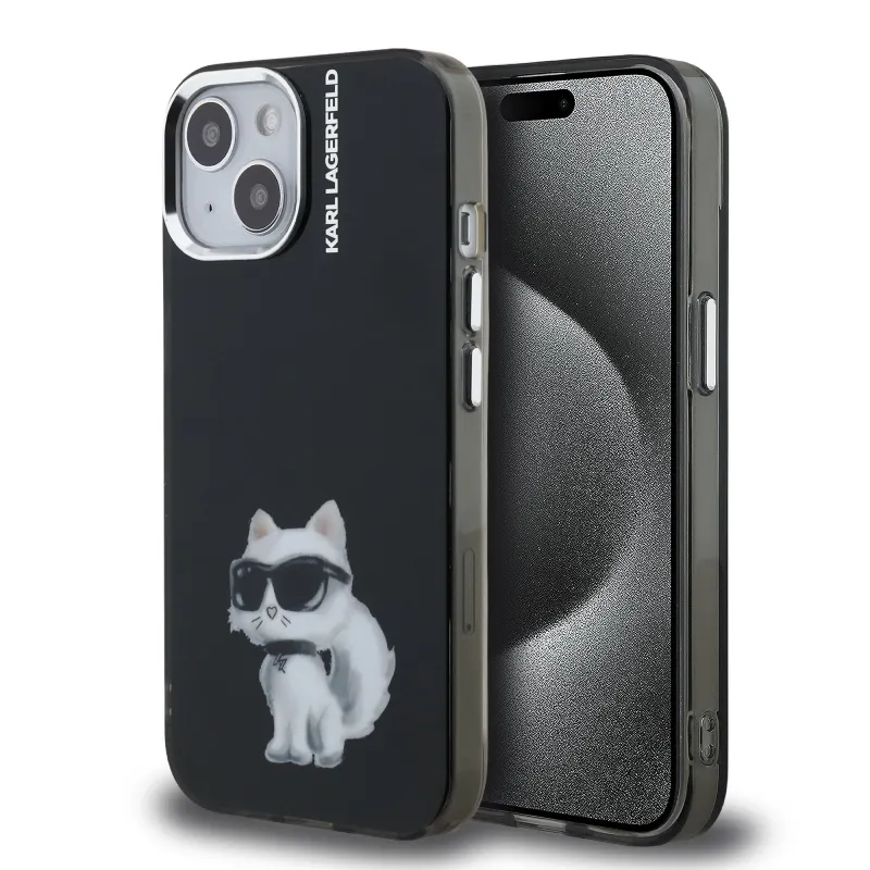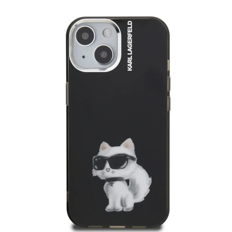 Karl Lagerfeld IML Aquarelle Choupette hátlapi borító iPhone 15-hez Fekete