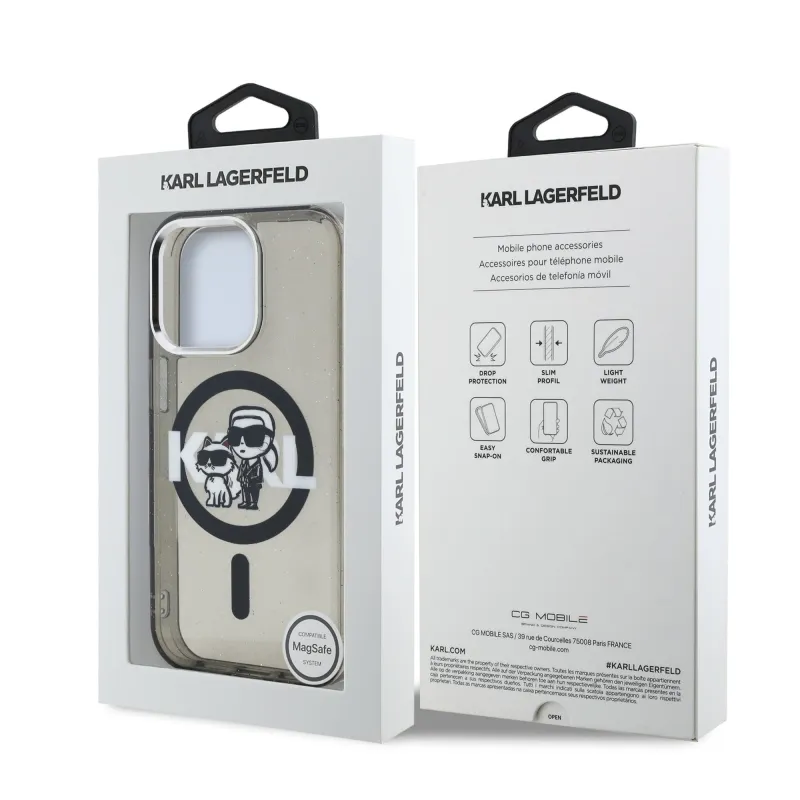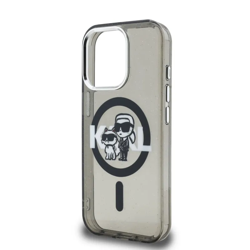 Karl Lagerfeld IML Glitter Karl és Choupette Sketch MagSafe hátlapi borító iPhone 15 Pro-hoz Fekete