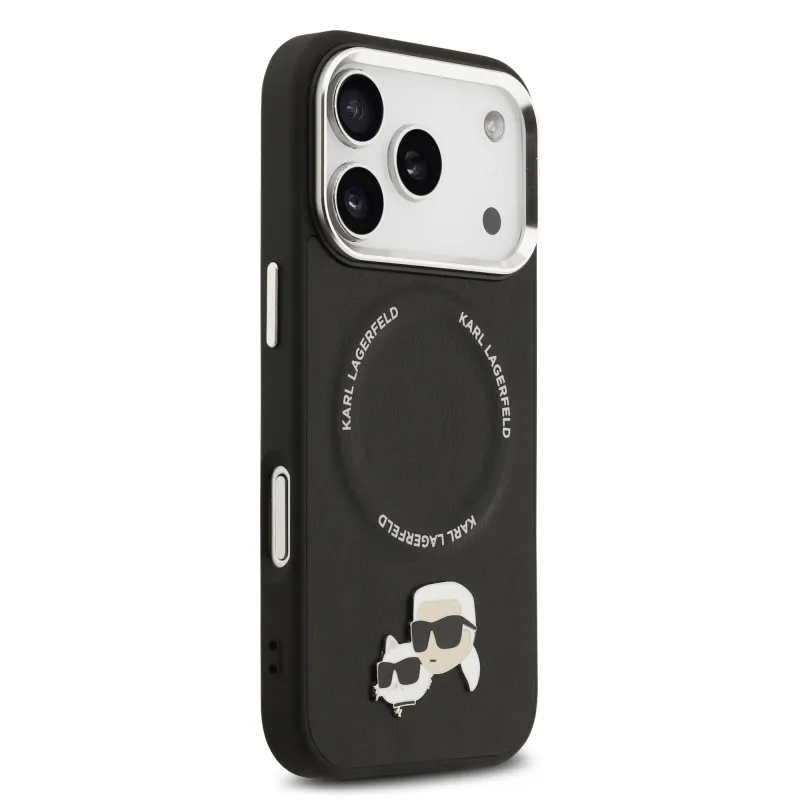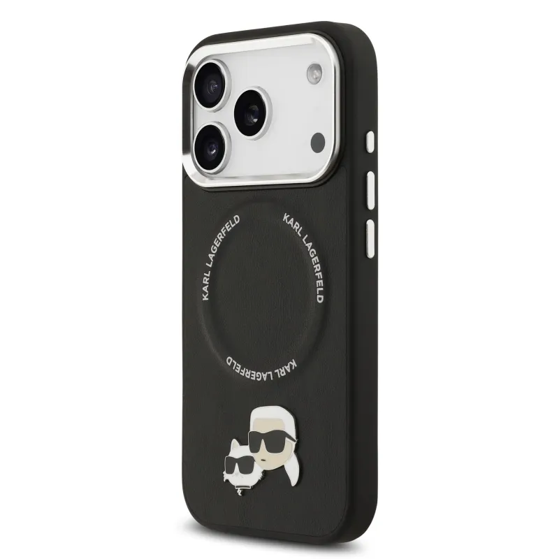 Karl Lagerfeld PU Karl és Choupette fejek díszítéssel, MagSafe hátlap iPhone 17 Pro Maxhoz, fekete