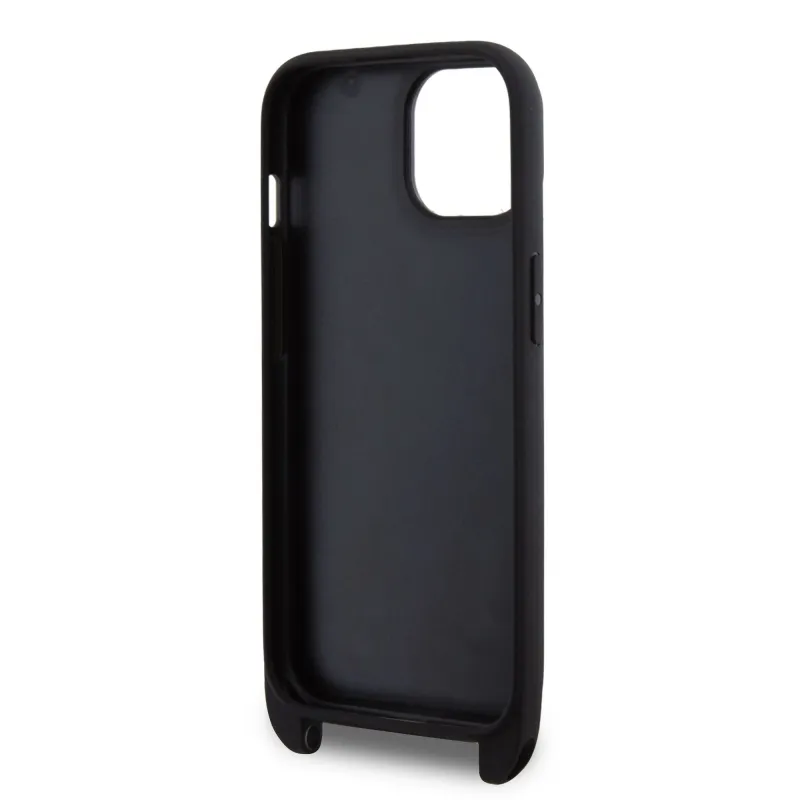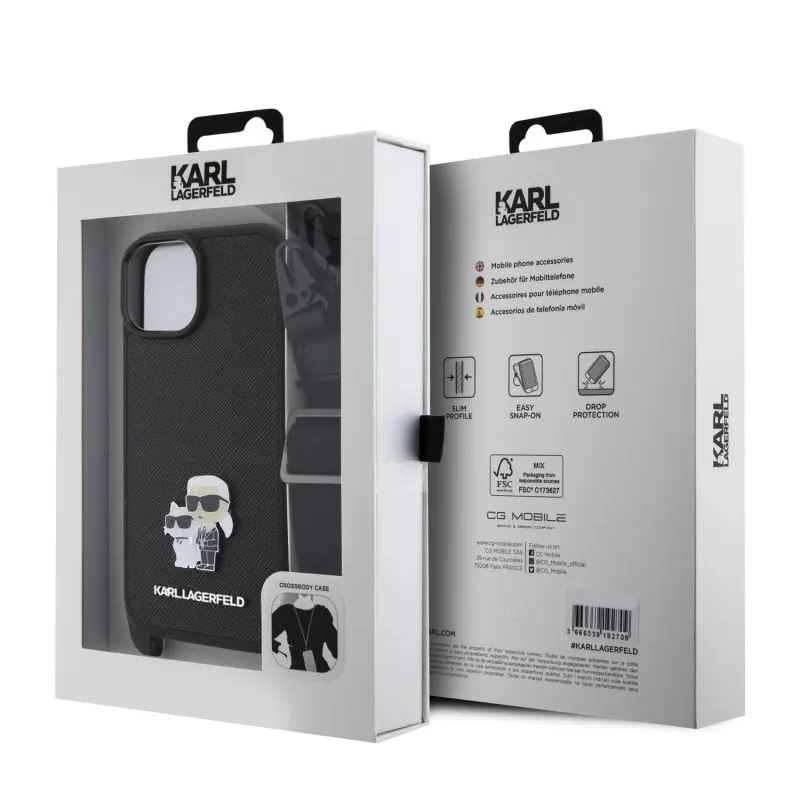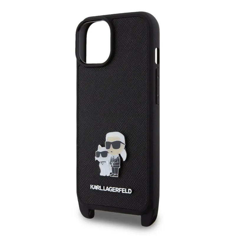 Karl Lagerfeld Saffiano Crossbody fém fém Karl és Choupette hátlap iPhone 15-hez fekete