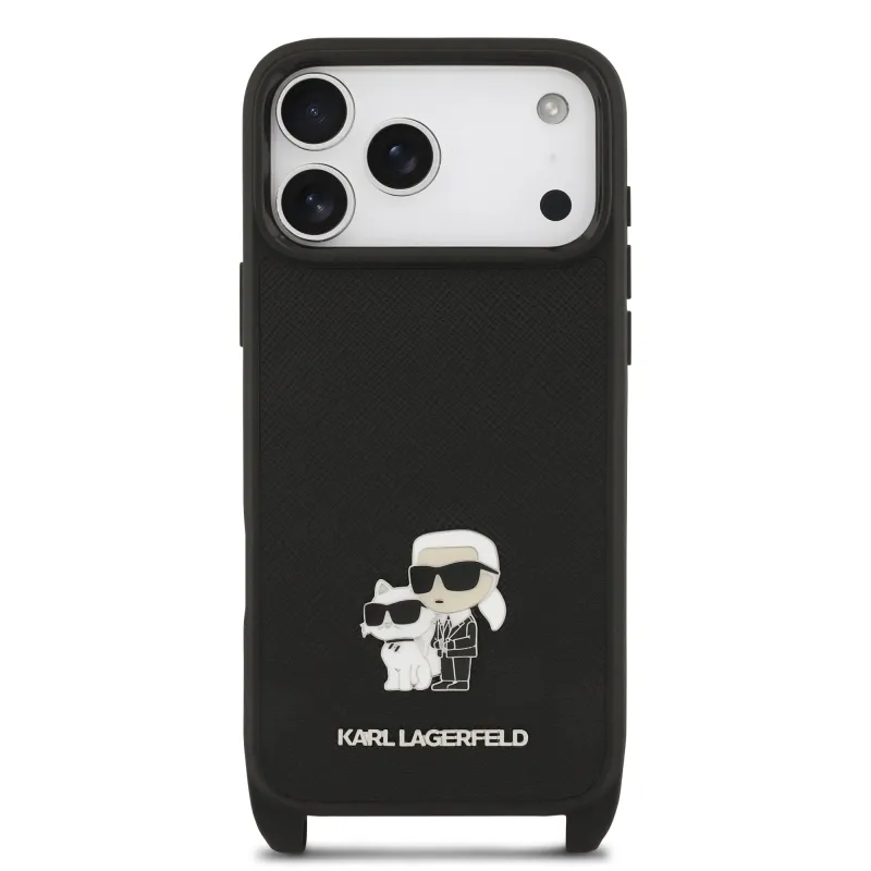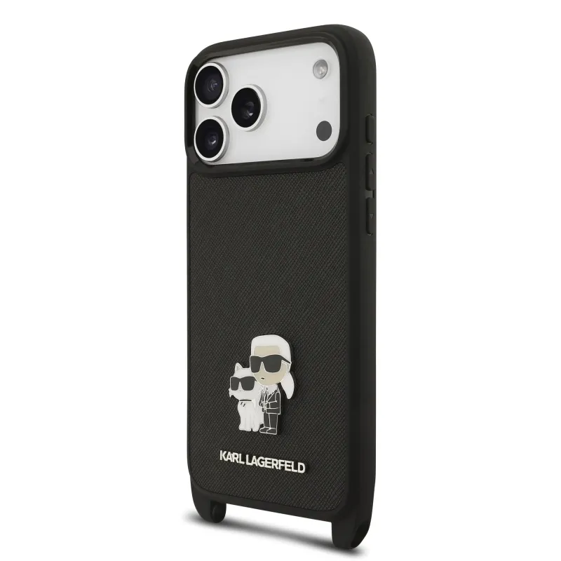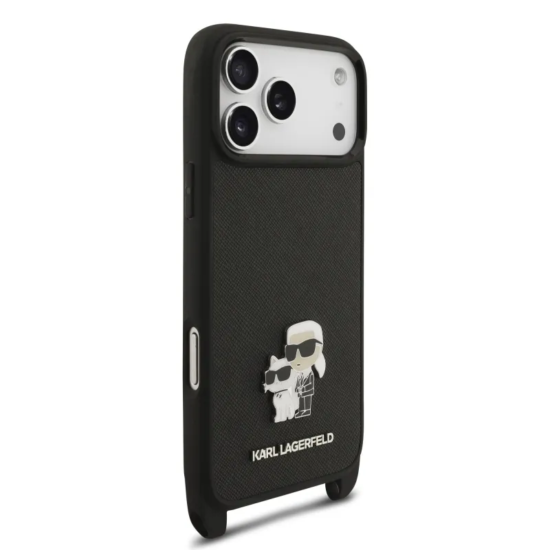 Karl Lagerfeld Saffiano Crossbody Strap Metal Karl és Choupette hátlapi borító iPhone 17 Pro Max-hoz Fekete