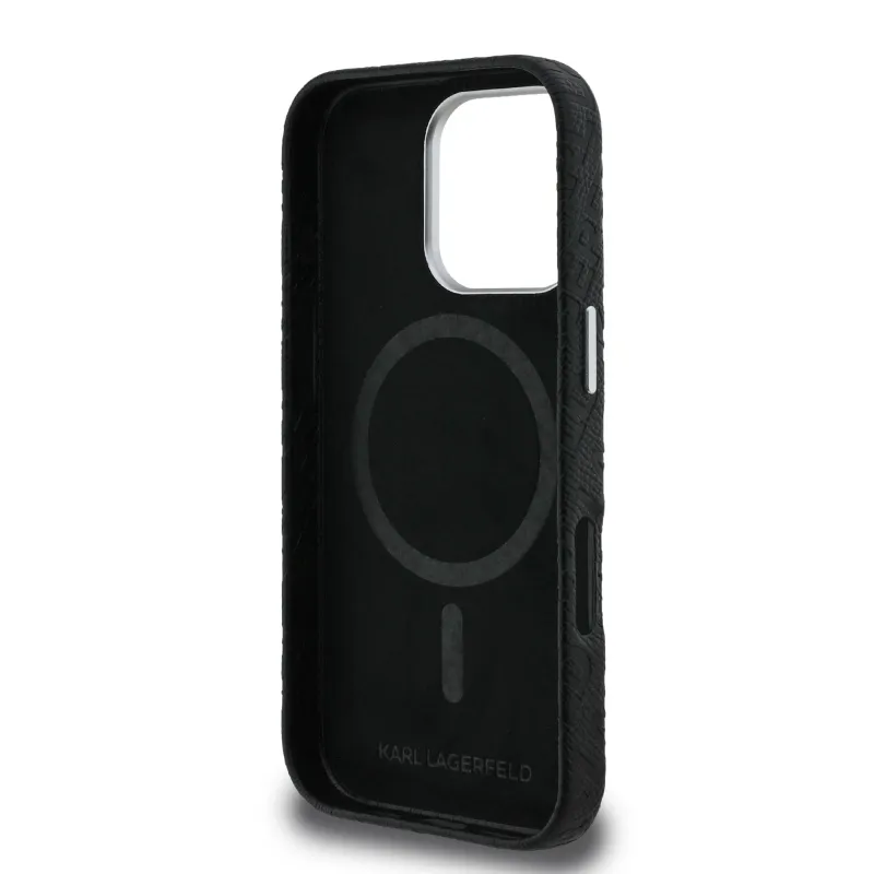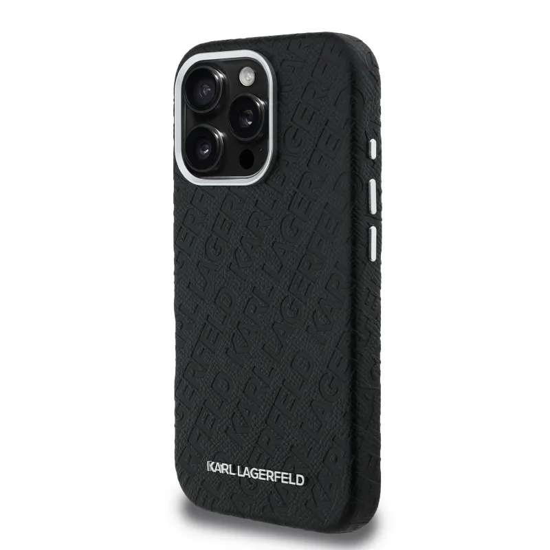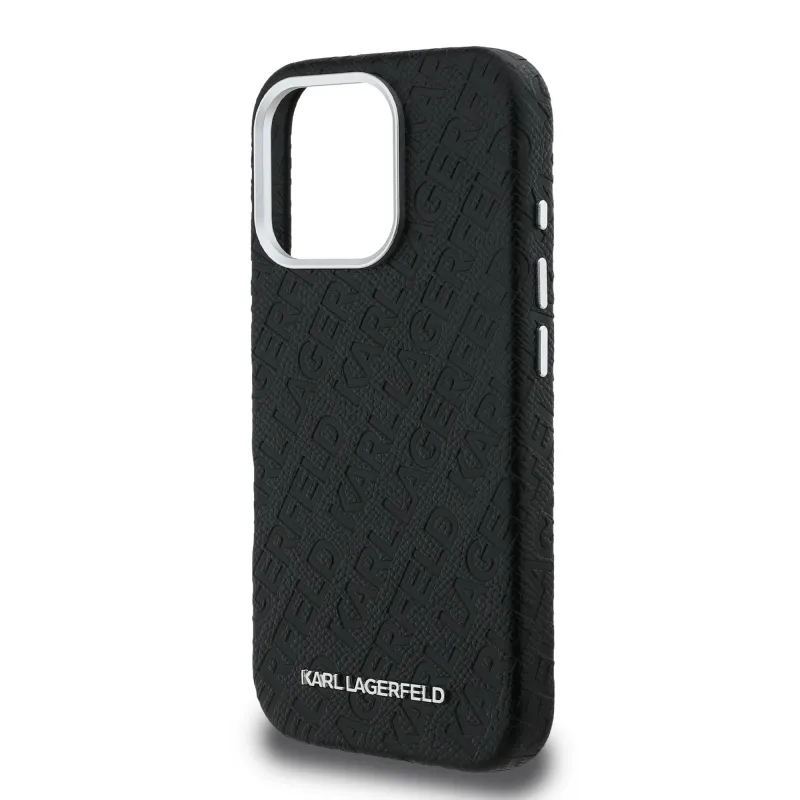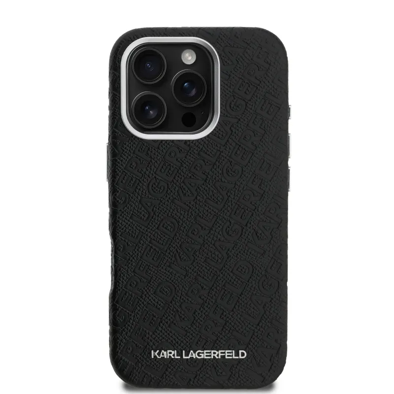 Karl Lagerfeld szemcsés PU ismétlődő logó MagSafe hátlap iPhone 16 Pro-hoz Fekete