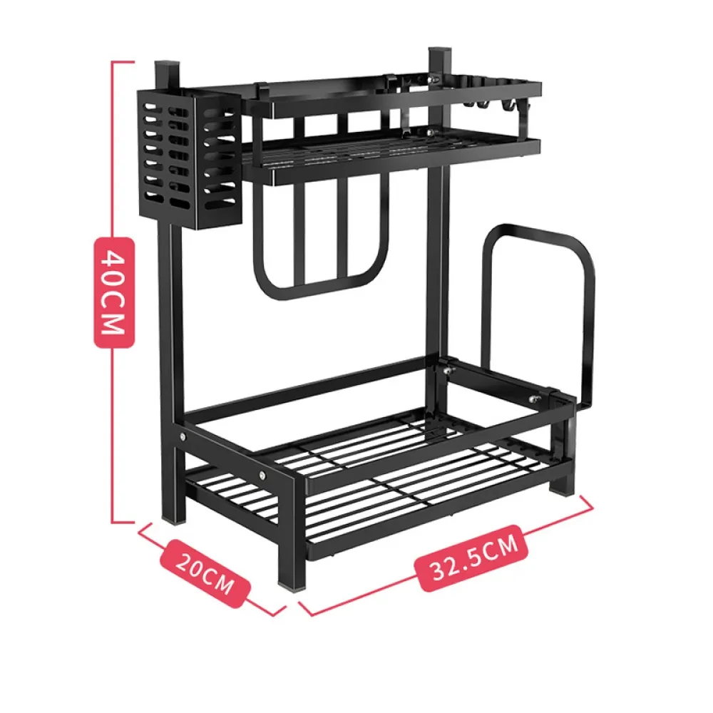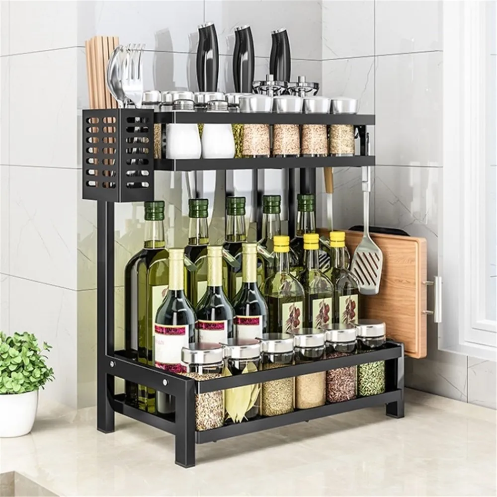 A praktikus kétszintes konyhai állvány szénacélból készült, és átlátható tárolást biztosít fűszerek, kések és egyéb kiegészítők számára. A két szint hatékonyan kihasználja a konyhapulton rendelkezésre álló helyet, és segít rendben tartani a munkafelületet. A masszív szénacél szerkezet stabilitást és hosszú élettartamot garantál. Az elegáns fekete dizájn modern és klasszikus enteriőrökbe egyaránt illeszkedik.