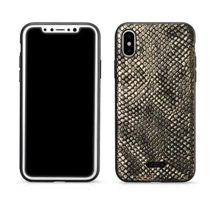Szilikon tok arany színű műbőr hátlappal kígyó mintával iPhone X készülékhez