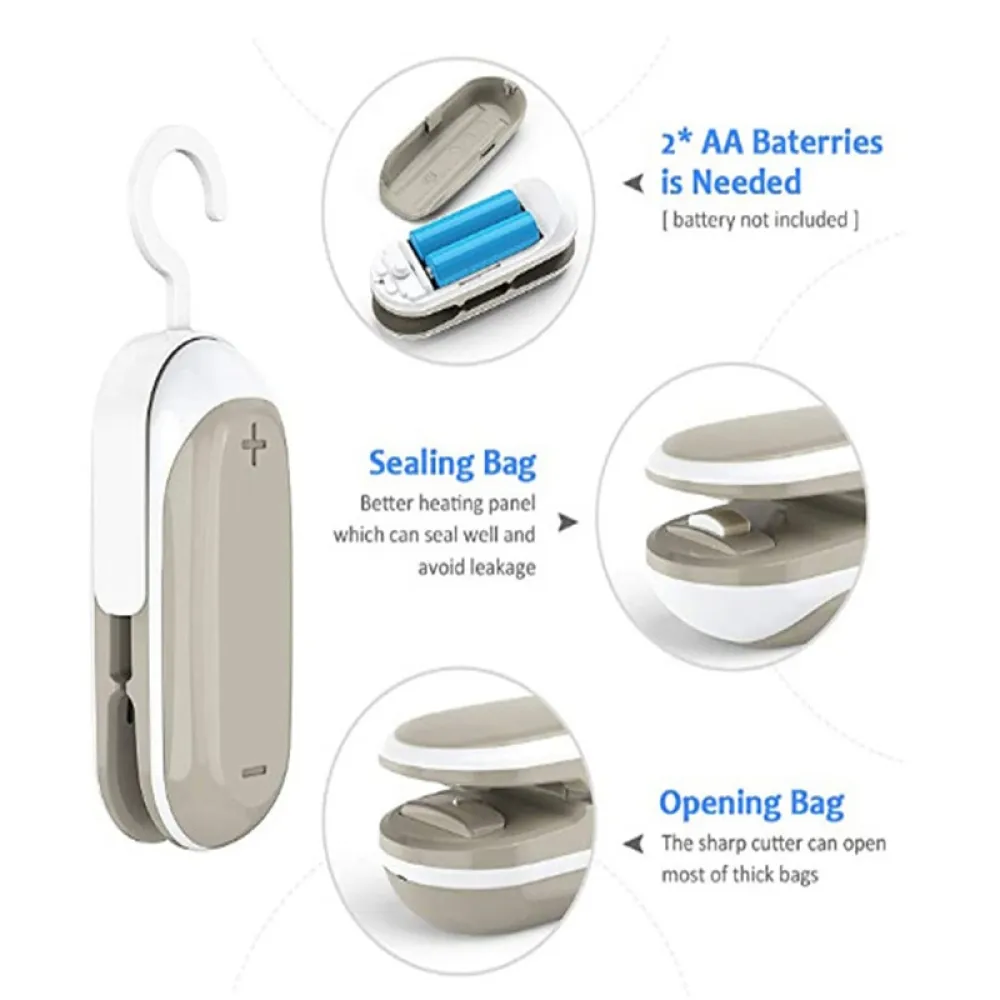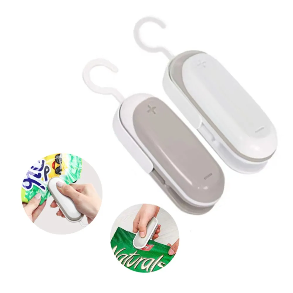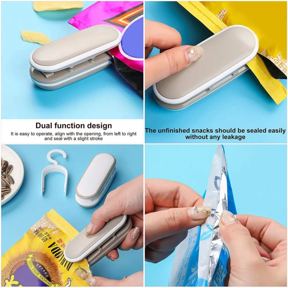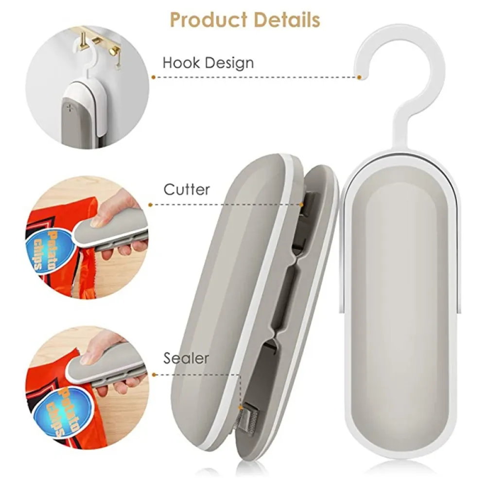 A kompakt mini kézi zacskóhegesztő praktikus eszköz a felbontott élelmiszer-csomagolások lezárásához. Gyorsan lezárja a műanyag zacskókat, így segít megőrizni a frissességet és megvédeni a tartalmat a nedvességtől. Az egyszerű kézi működtetés könnyű használatot biztosít a mindennapokban. A szürke műanyag kivitel könnyű, helytakarékos és könnyen elfér egy fiókban.