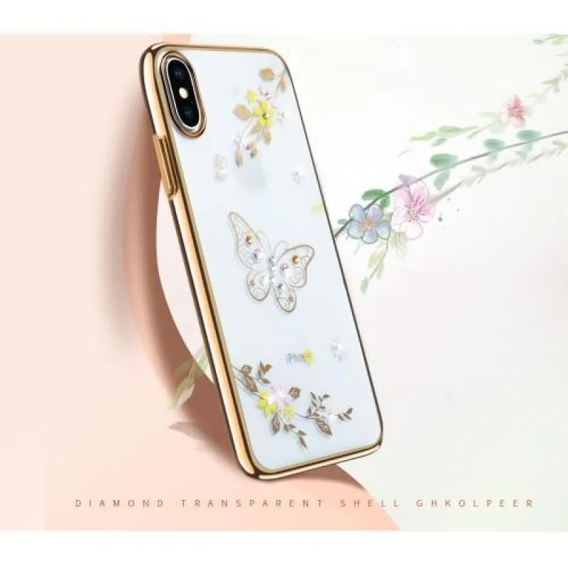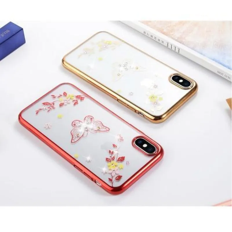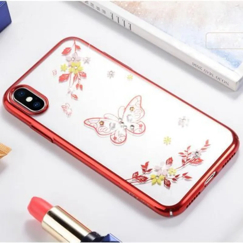 Műanyag borítás piros áramkörrel iPhone X készülékhez pillangókkal és strasszkövekkel díszített virágokkal