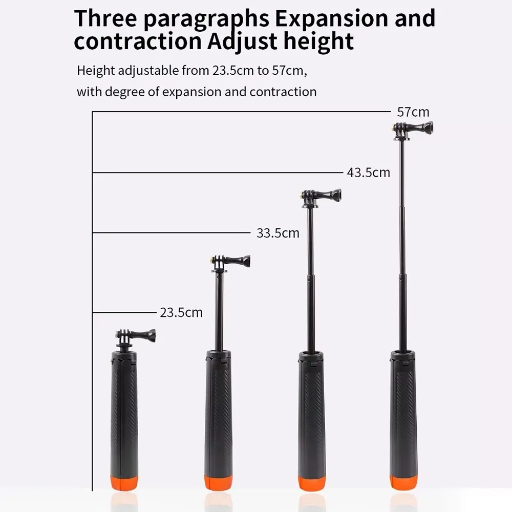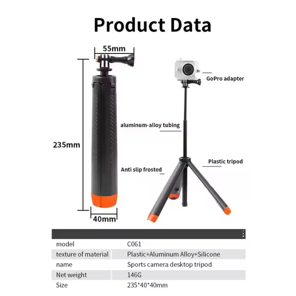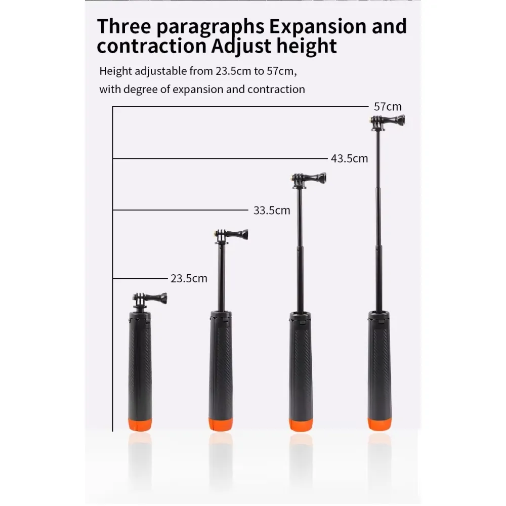 Modell: C063 Tartozék típusa: lebegő selfie bot és stabilizátor Súly: 149 g Összecsukott méret: 235 × 40 mm Magasságtartomány: 32,5 – 57 cm Tulajdonságok: lebegő kivitel, képstabilizálás, vízálló használat Menet: szabványos 1/4" Rendeltetés: GoPro és egyéb kompatibilis akciókamerák Szín: narancssárga / fekete kombináció