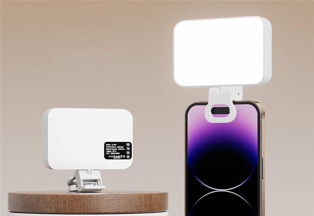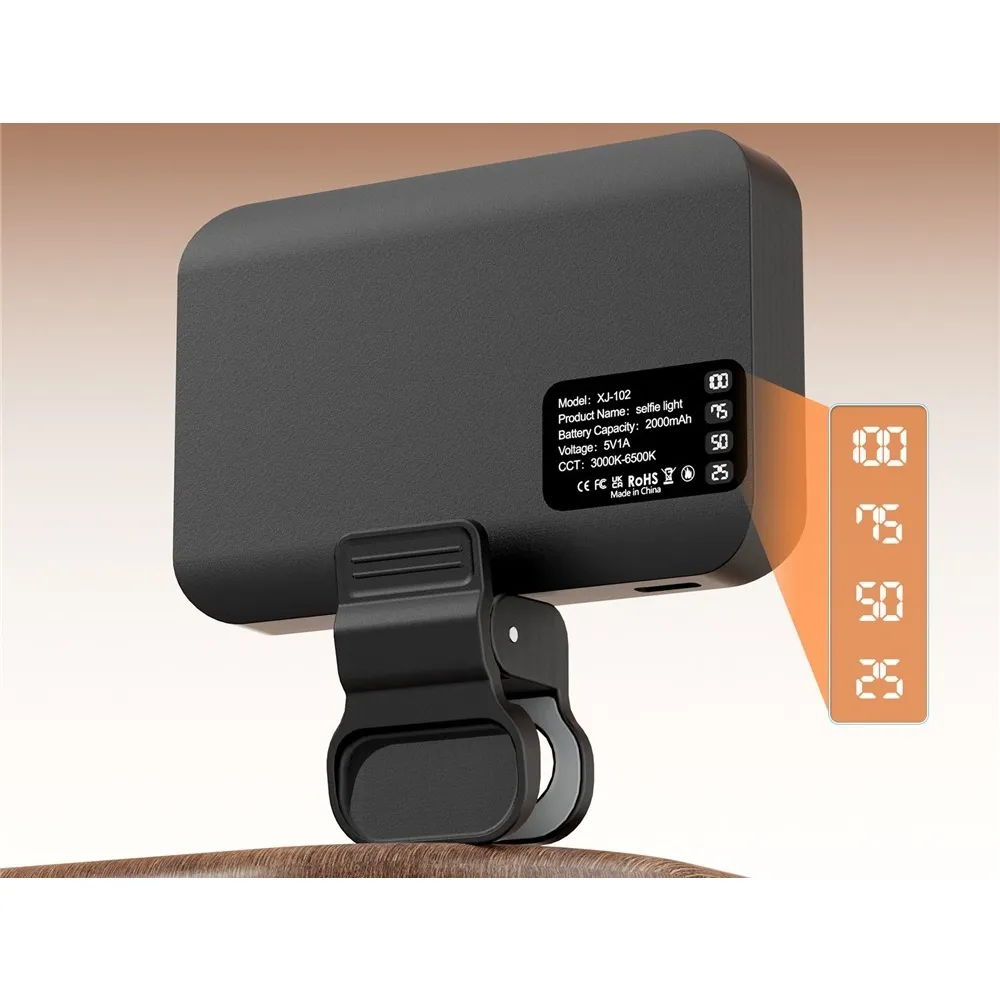 XJ102 hordozható LED kiegészítő fény csipesszel, 3 fényhőmérséklettel praktikus világítás videók készítéséhez, livestreamhez, fotózáshoz és videóhívásokhoz. Kompakt méretének és csipeszének köszönhetően könnyen rögzíthető telefonra, notebookra vagy állványra, így minden helyzetben jobb megvilágítást biztosít.