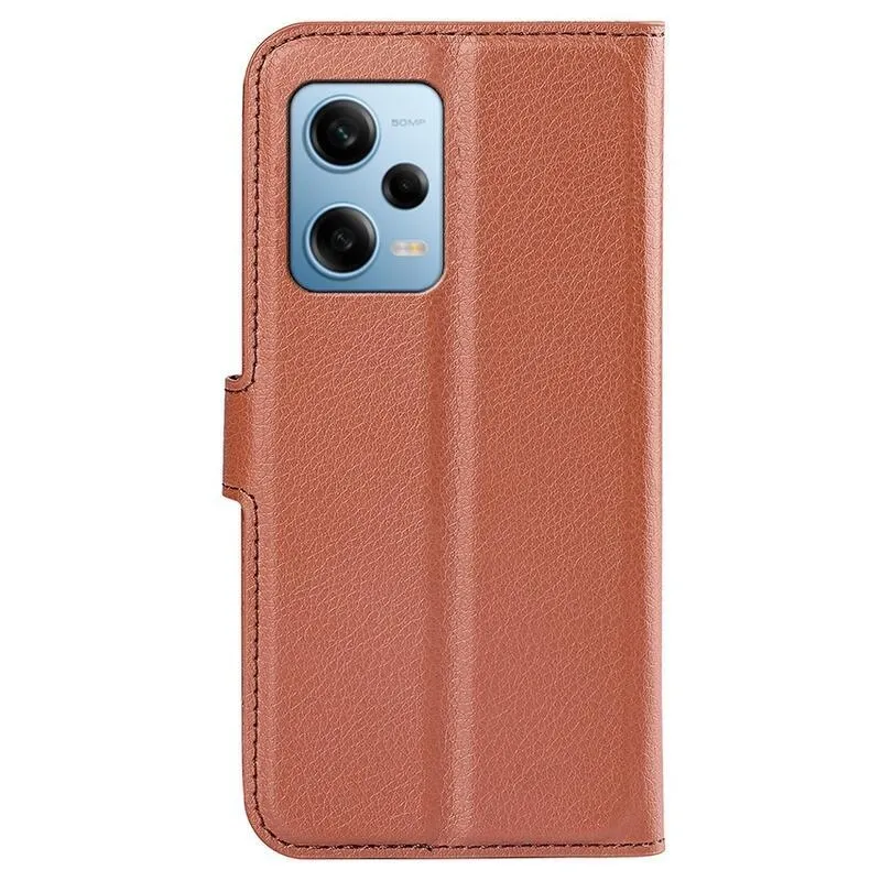 Litchi barna pénztárca tok Xiaomi Redmi Note 12 Pro 5G/Poco X5 Pro 5G számára