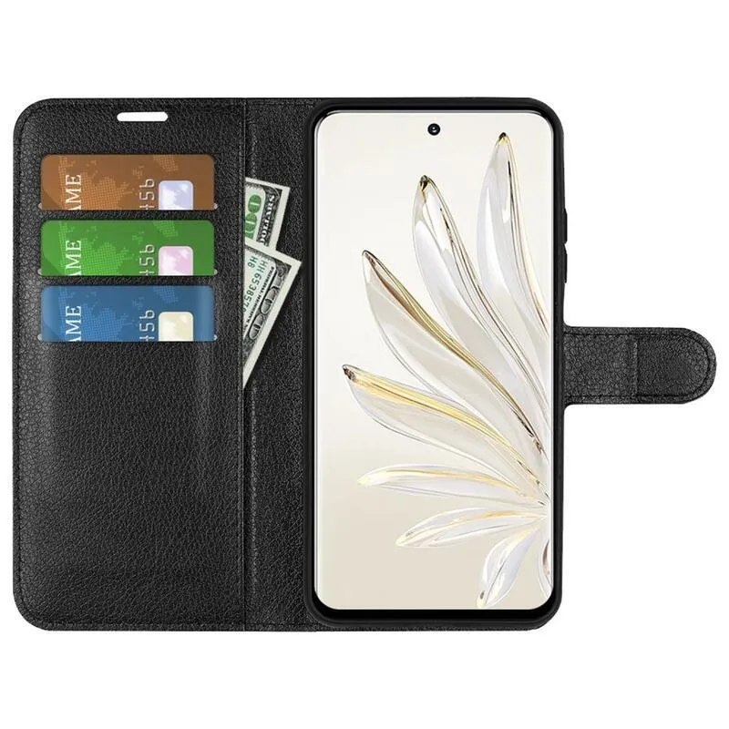 Litchi PU bőr pénztárca tok a Honor 70 5G számára - fekete