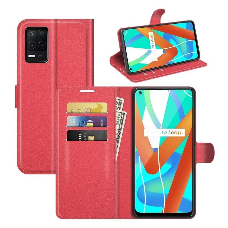 Litchi PU bőr pénztárca tok a Realme 8 5G-hez - piros
