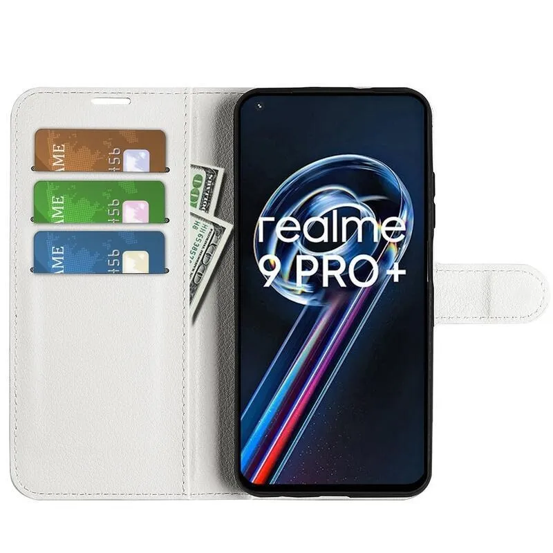 Litchi PU bőr pénztárca tok a Realme 9 Pro+ 5G számára - fehér