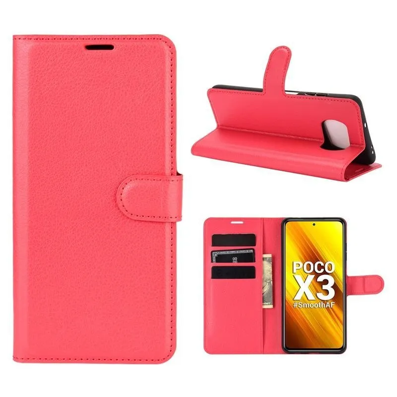 Litchi PU bőr pénztárca tok a Xiaomi Poco X3/X3 Pro-hoz - piros