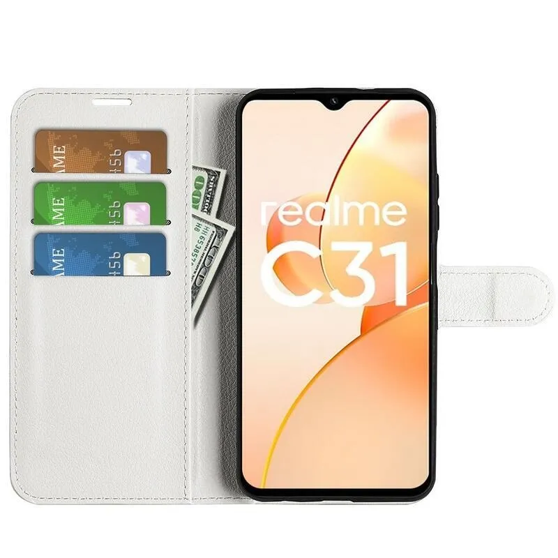 Litchi PU bőr pénztárca tok mobilhoz Realme C31 - fehér