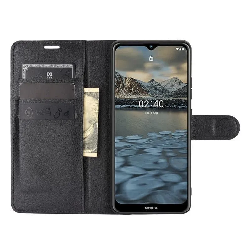 Litchi PU bőr pénztárca tok Nokia 2.4 készülékhez - fekete