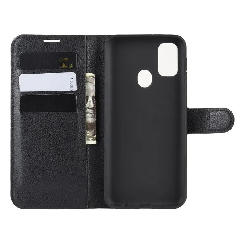 Litchi PU bőr pénztárca tok Samsung Galaxy M21-hez - fekete