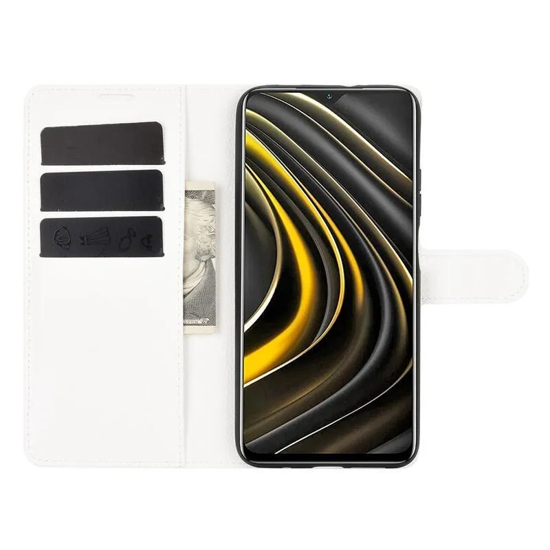 Litchi PU bőr pénztárca tok Xiaomi Poco M3-hoz - fehér