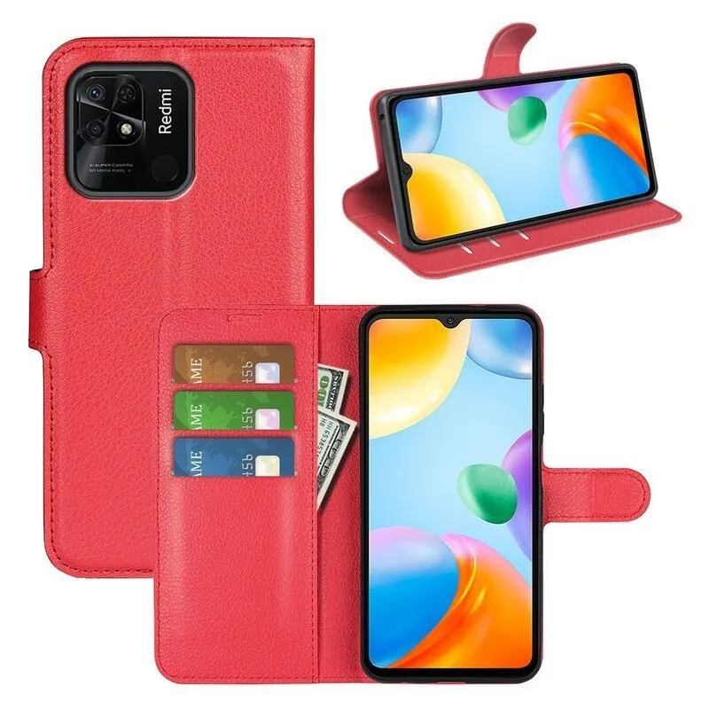Litchi PU bőr pénztárca tok Xiaomi Redmi 10C-hez - piros