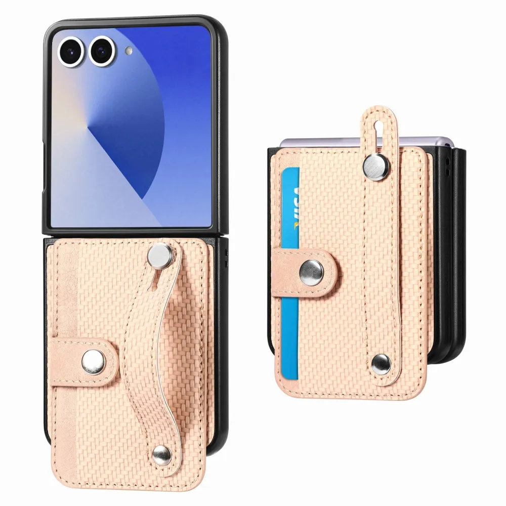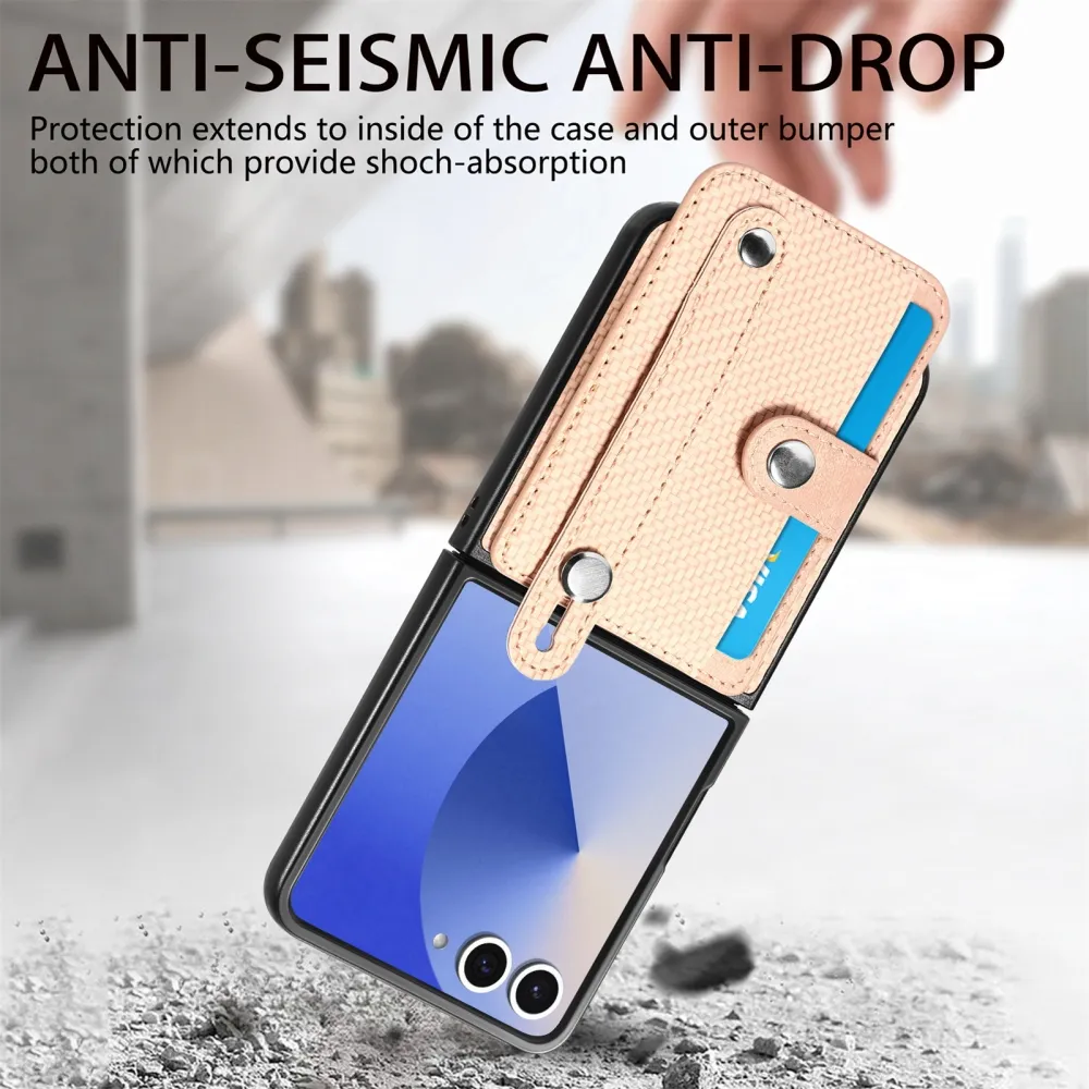 ✅【Prémiová konštrukcia】 Wrisat plastový kryt v khaki farbe na mobil Samsung Galaxy Z Flip7 5G je vyrobený z materiálu PC+TPU potiahnutého PU kožou z uhlíkových vlákien, čo zaisťuje odolnosť a elegantný vzhľad.