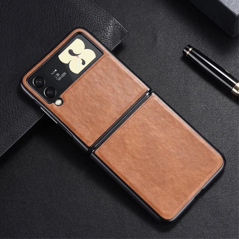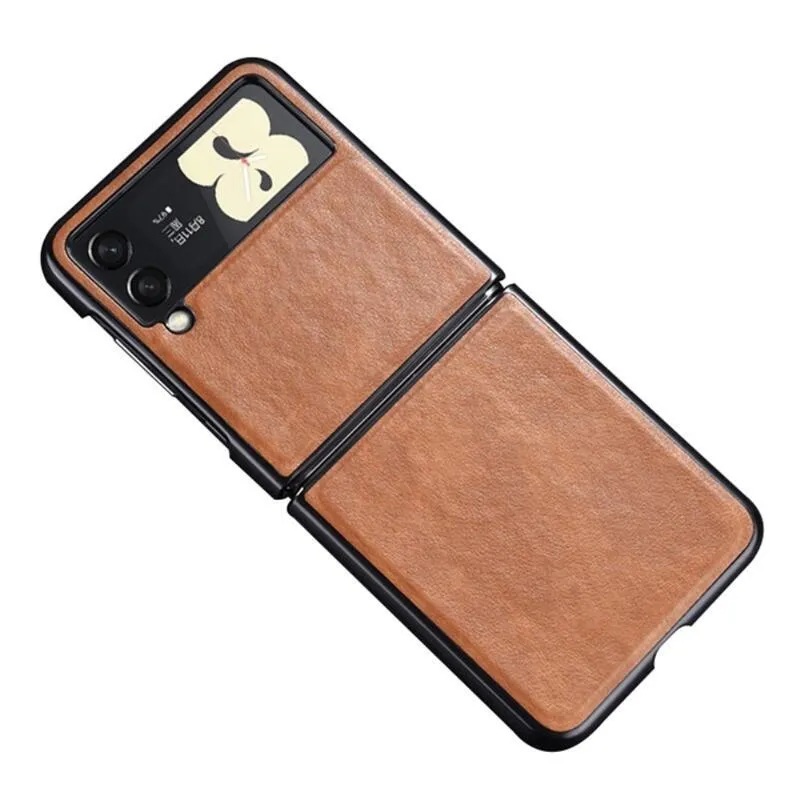 Műbőrrel borított műanyag tok a Samsung Galaxy Z Flip3 5G mobiltelefonra - barna