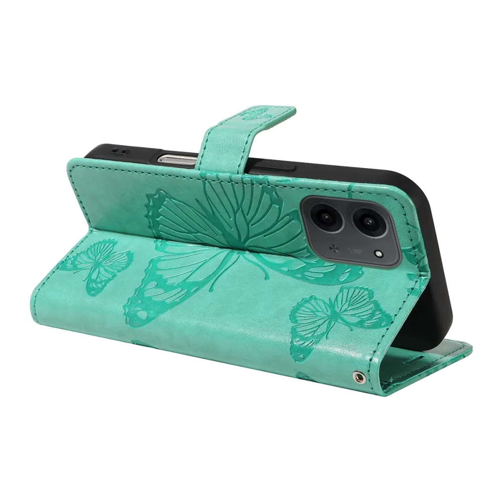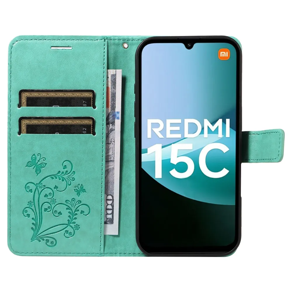 Kék-zöld pénztárca tok Nagy pillangó a Xiaomi Redmi 15C 4G/5G (173mm) számára
