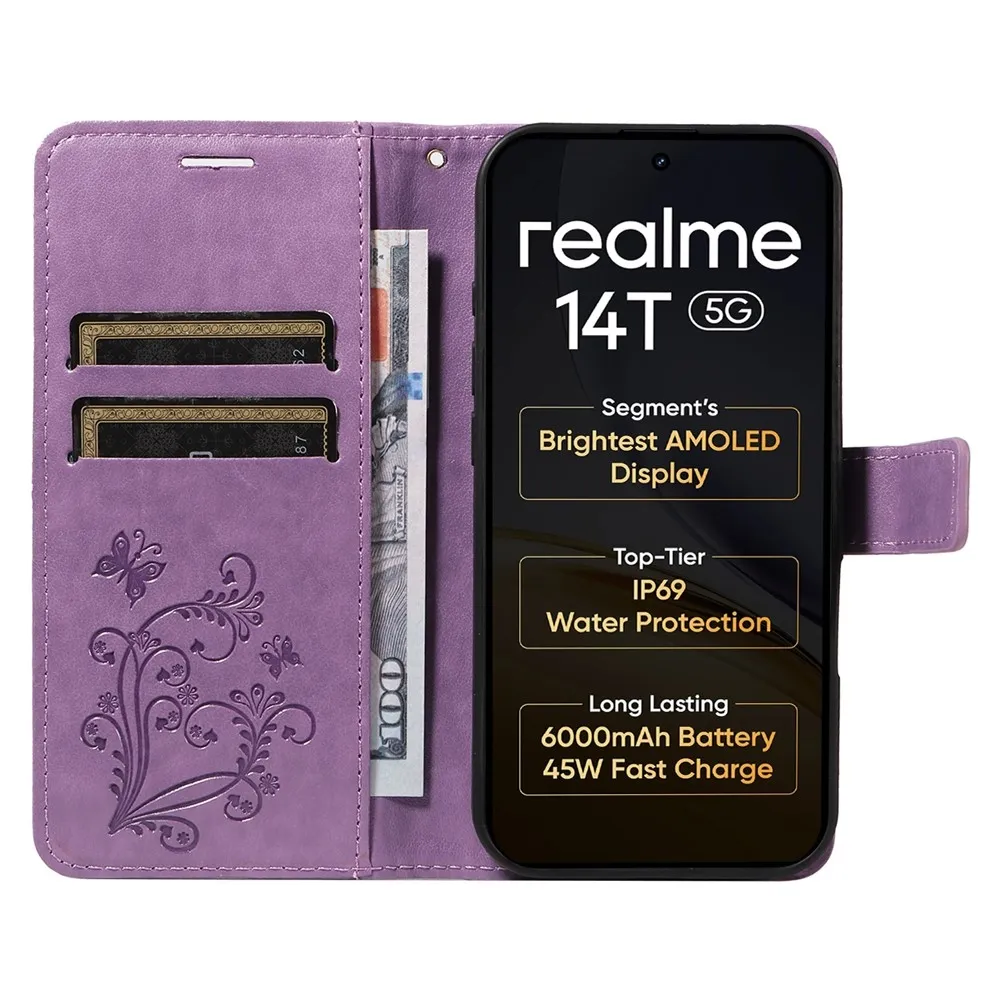 Nagy pillangó könyvtáska a Realme 14 5G/14T 5G számára - lila