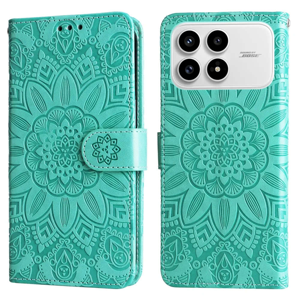 Kék-zöld pénztárca tok Napraforgó a Xiaomi Poco F8 Pro 5G számára