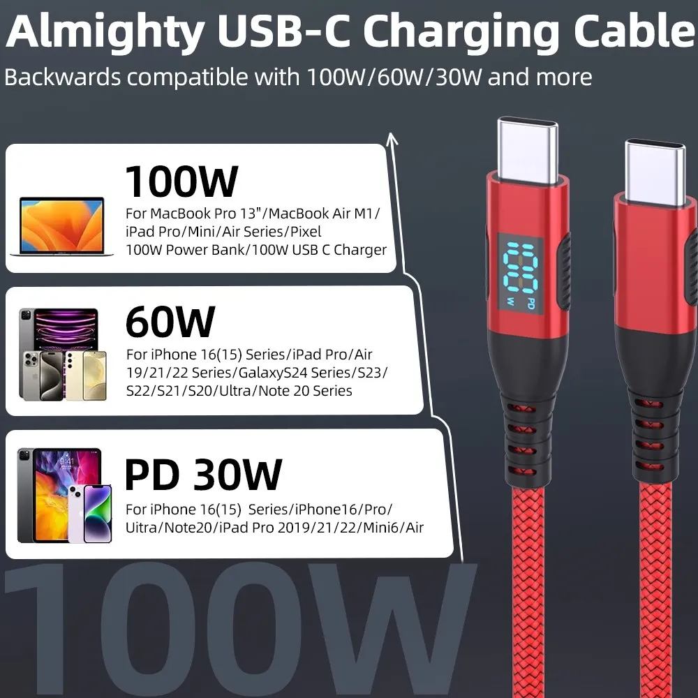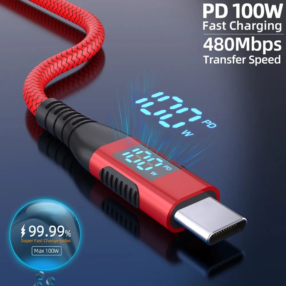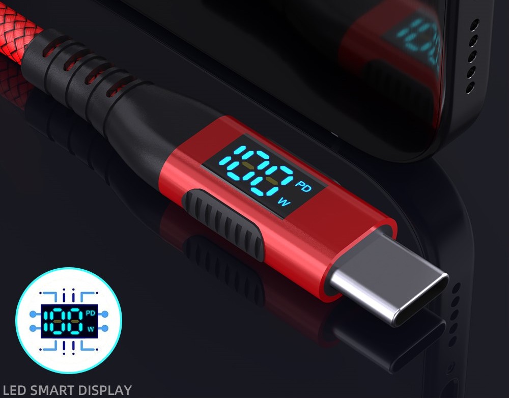 Tartós, piros USB-C kábel kijelzővel, 1 m hosszú és támogatja a 100 W-os gyorstöltést a maximális teljesítmény érdekében.