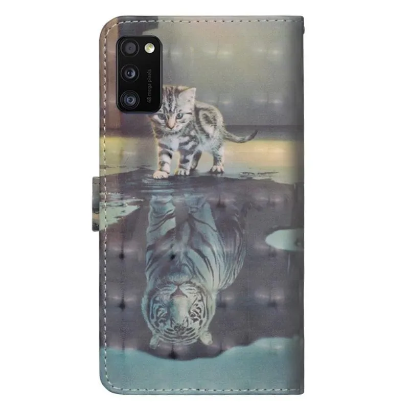 Nyomtatás PU bőr pénztárca tok Samsung Galaxy A41 - macska és tigris tükörkép