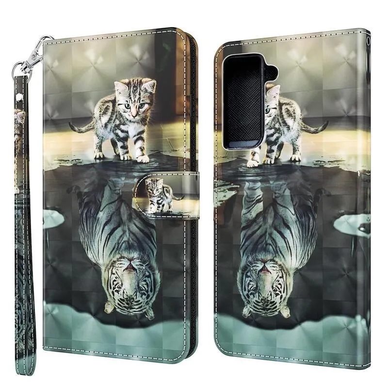 Könyvborító Nyomtatás mobil Samsung Galaxy S21 Plus macskával és tigris tükörképével
