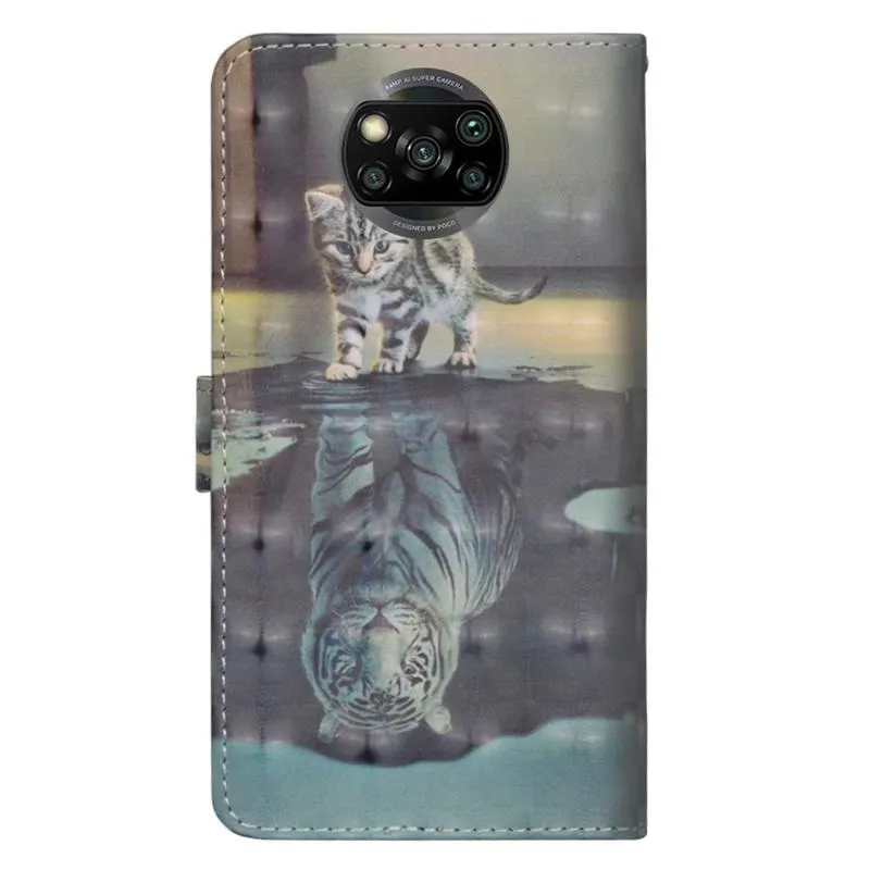 Nyomtatás PU bőr pénztárca tok Xiaomi Poco X3/X3 Pro - macska és tigris tükörkép