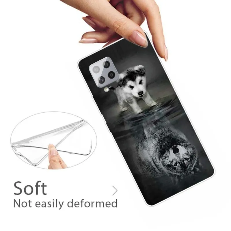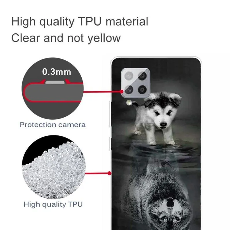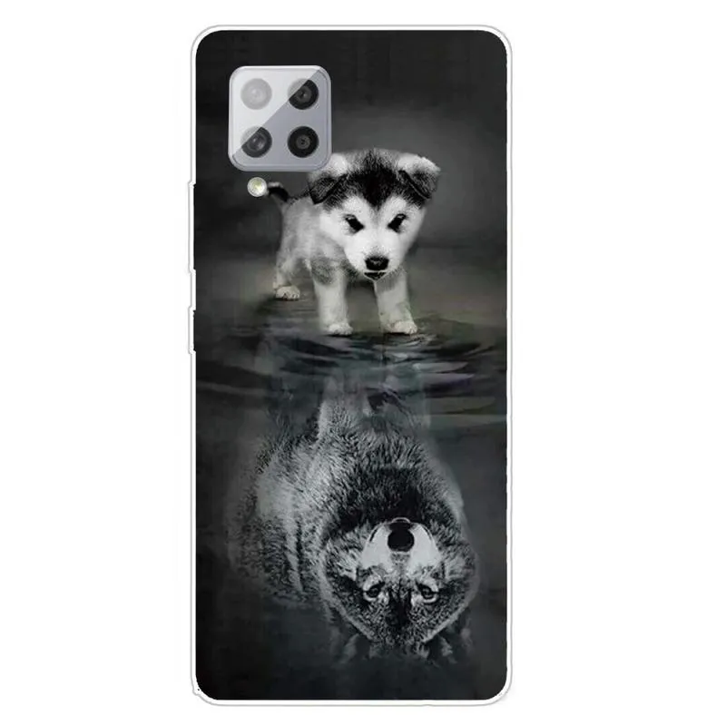 Szilikon tok Nyomtatás a mobiltelefonra Samsung Galaxy A42 5G egy kutya és farkas tükröződéssel