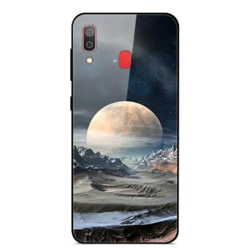 Szilikon tok Nyomtatás üveg hátlappal a mobiltelefonra Samsung Galaxy A30 / A20 fehér bolygó motívummal