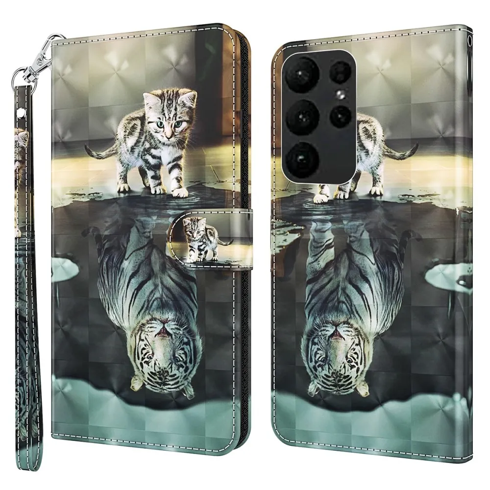 Tárca tok Nyomtatás Samsung Galaxy S24 Ultra készülékre egy macska és egy tigris képével