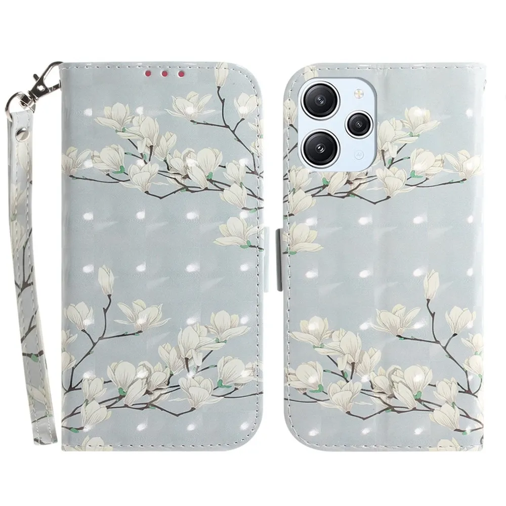 Tárca tok Nyomtatás Xiaomi Redmi 12 4G/5G fehér virágokkal