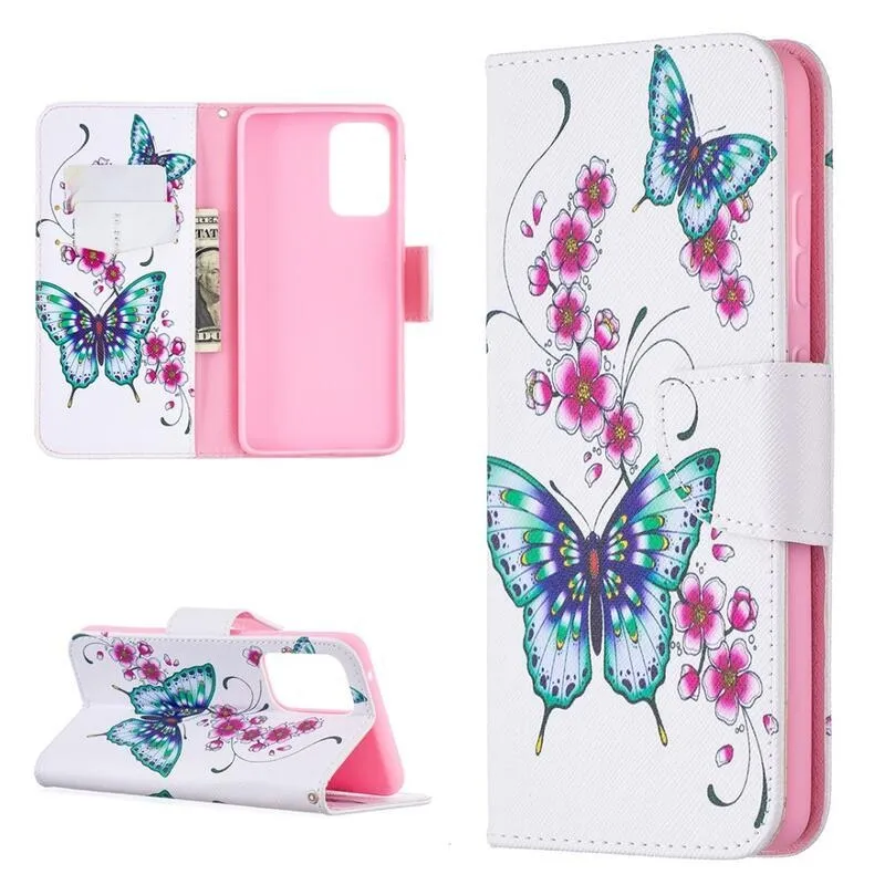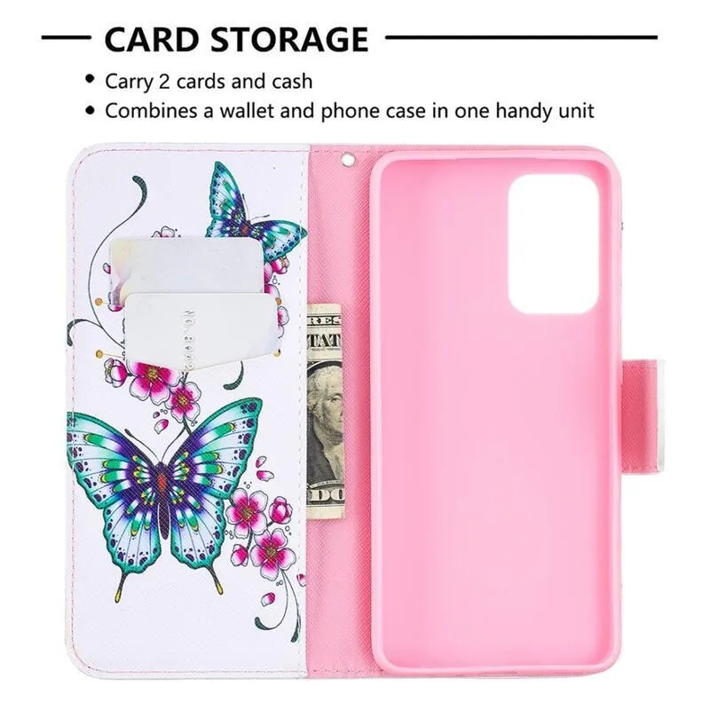 Nyomtatott pénztárca tok Samsung Galaxy A52 5G/4G/A52s 5G - zöld pillangók és virágok