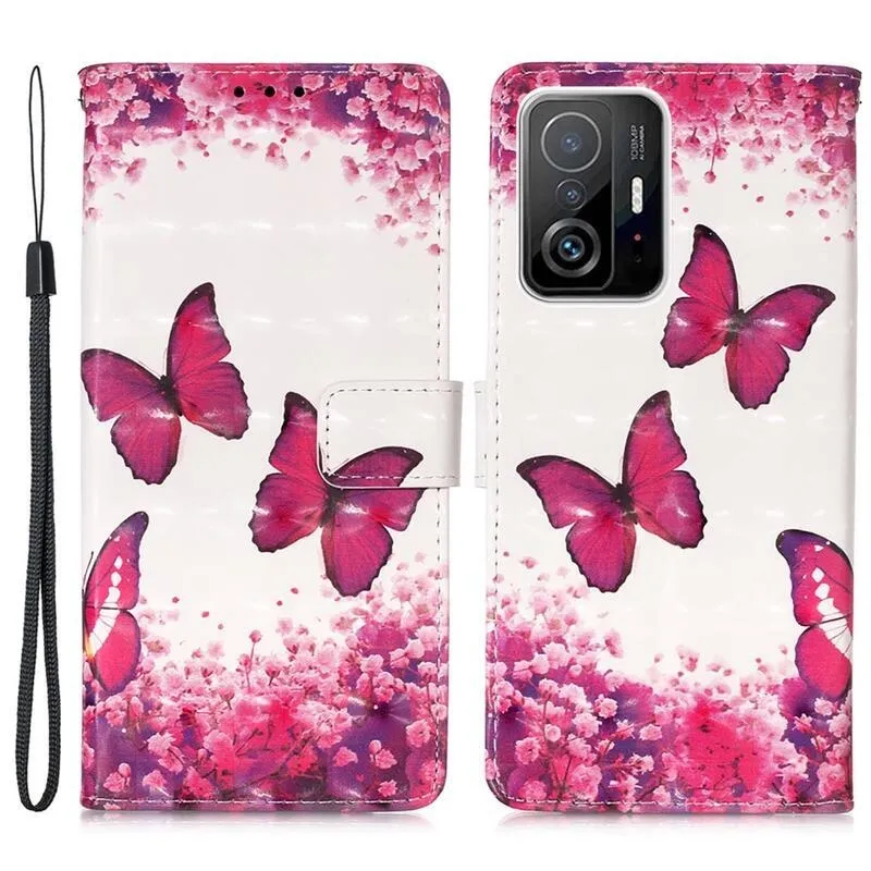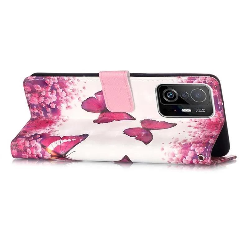 Nyomtatott pénztárca tok Xiaomi 11T/11T Pro - rózsaszín pillangókhoz