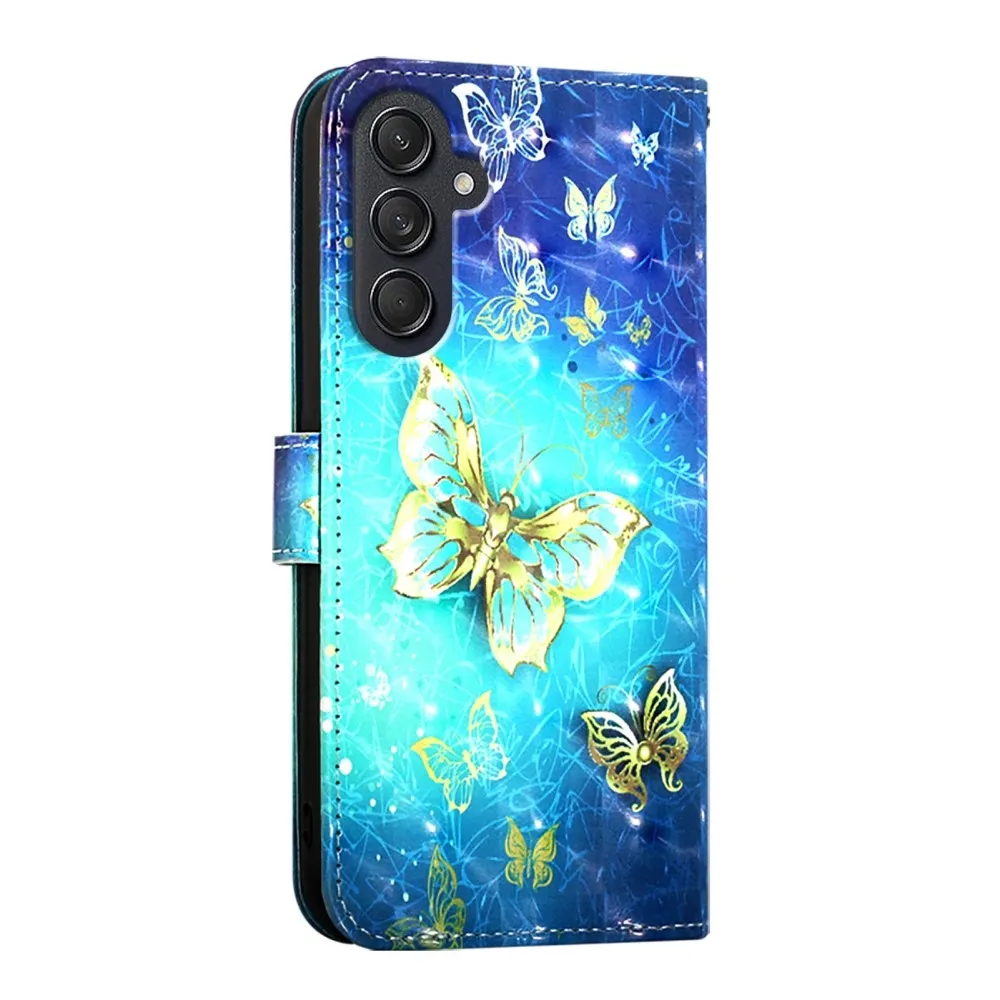 Tárca tok Patte a Samsung Galaxy M55 5G számára, kék-arany pillangók motívummal